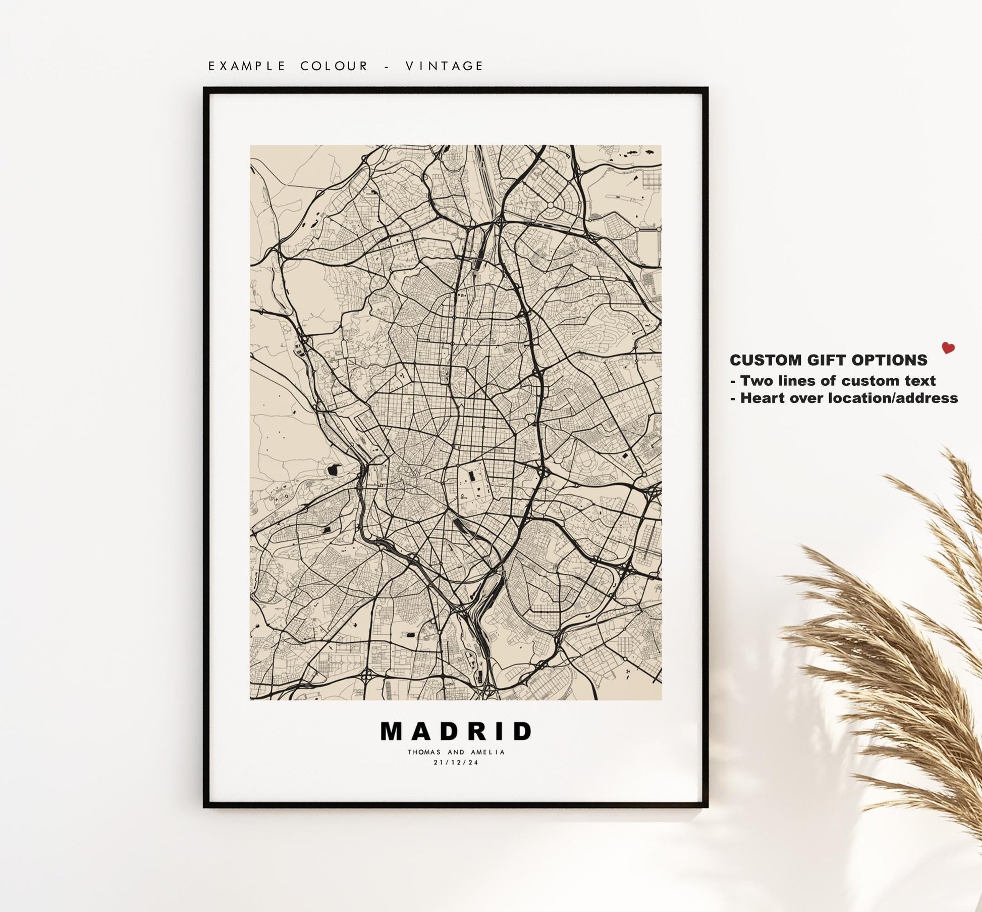 You can personalise this print by adding up to two lines of custom text beneath the city title, or by adding a heart over a location or address.