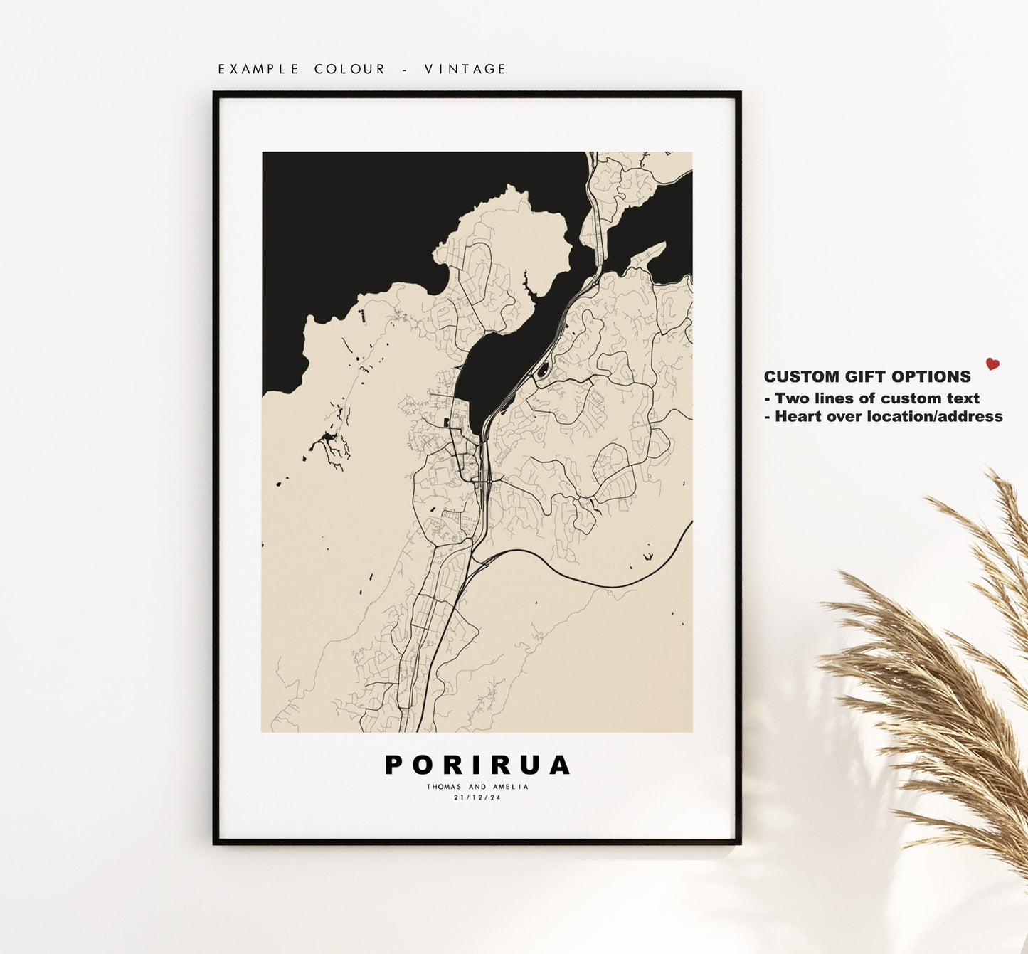 You can personalise this print by adding up to two lines of custom text beneath the city title, or by adding a heart over a location or address.
