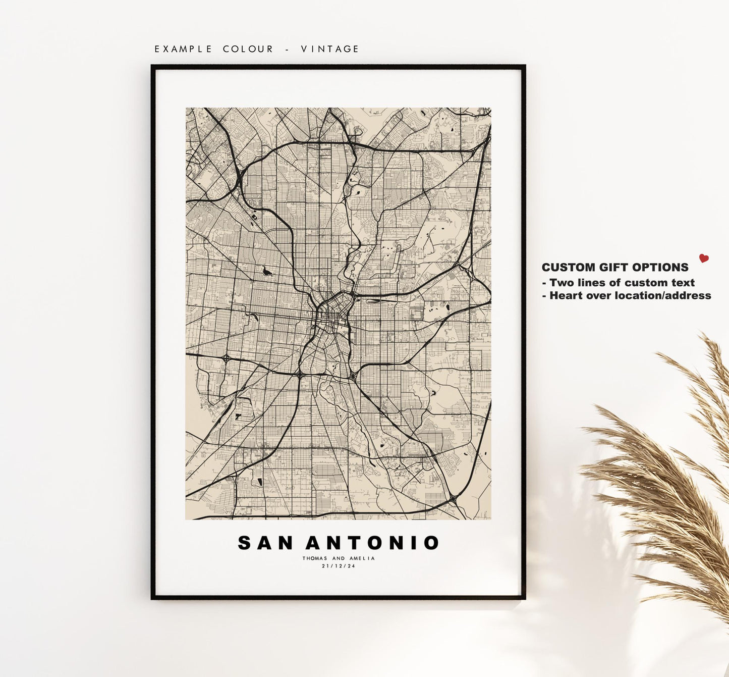 You can personalise this print by adding up to two lines of custom text beneath the city title, or by adding a heart over a location or address.