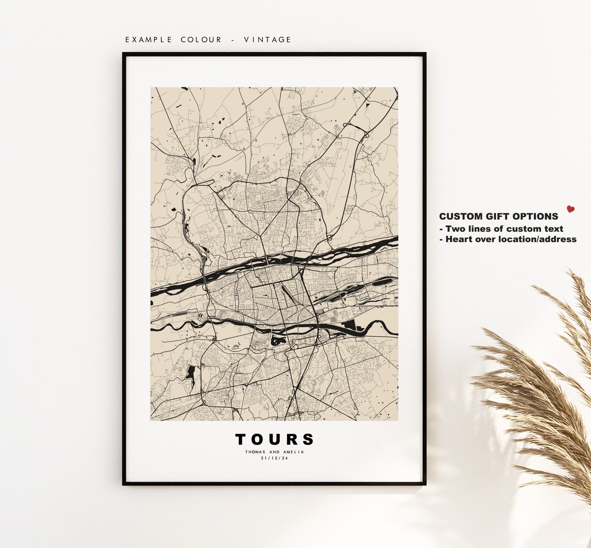 You can personalise this print by adding up to two lines of custom text beneath the city title, or by adding a heart over a location or address.