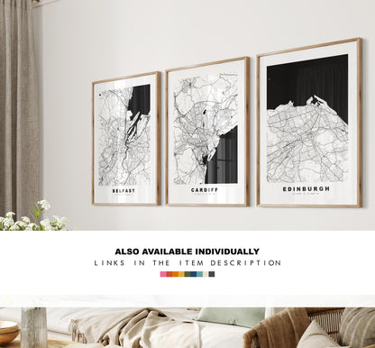 Map print in a minimalist black/white style or choose from a range of colours. These maps look great as a feature piece or as part of a set over a statement piece of furniture.