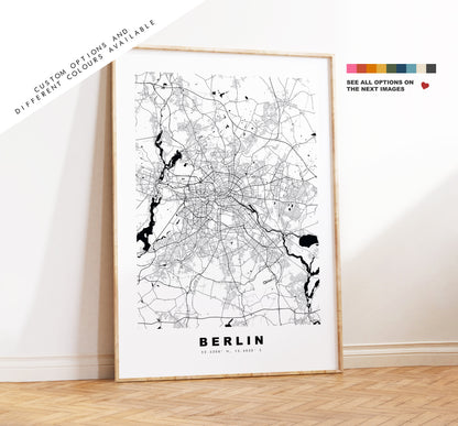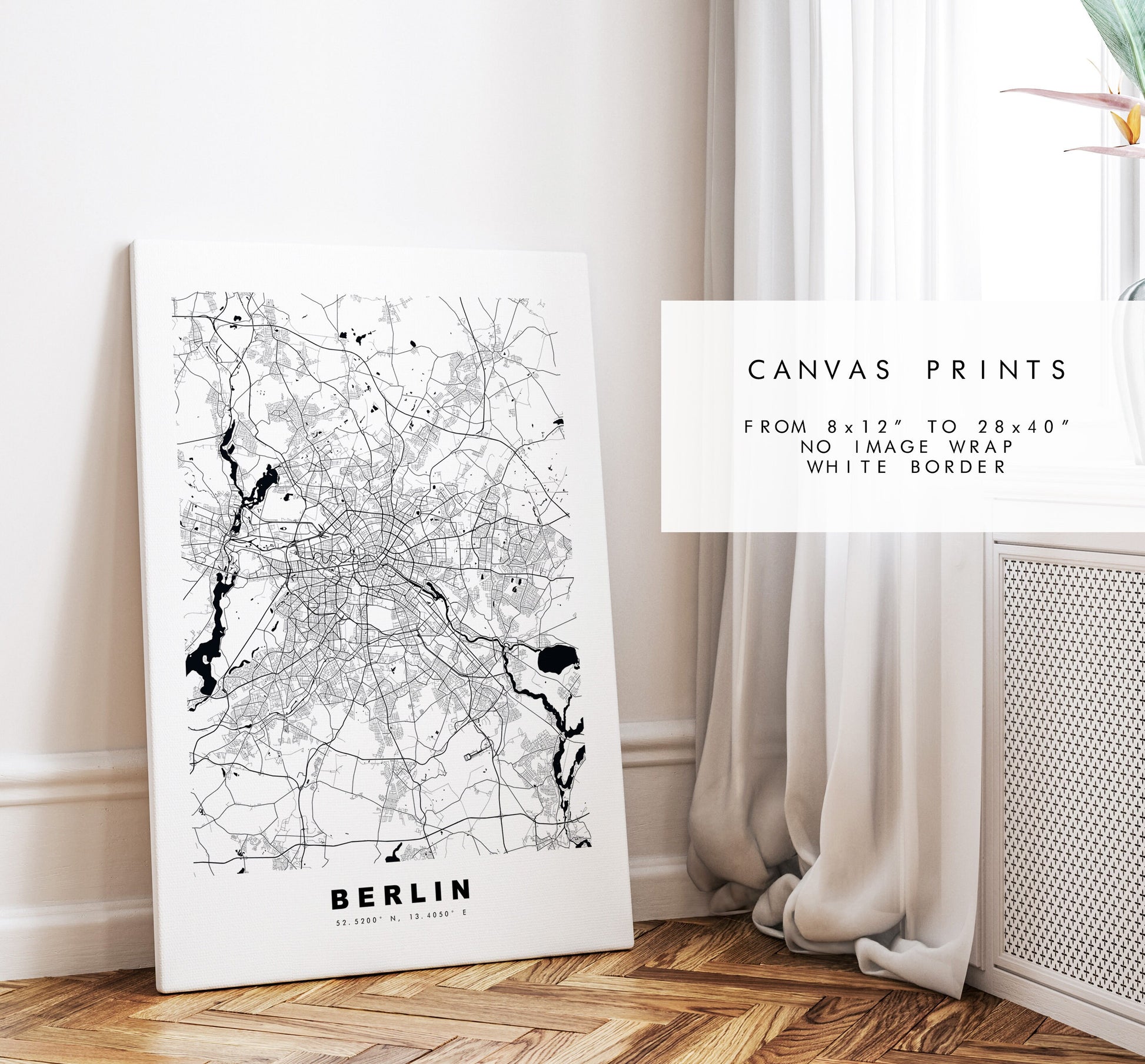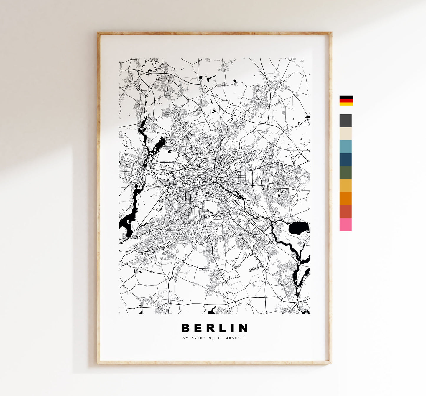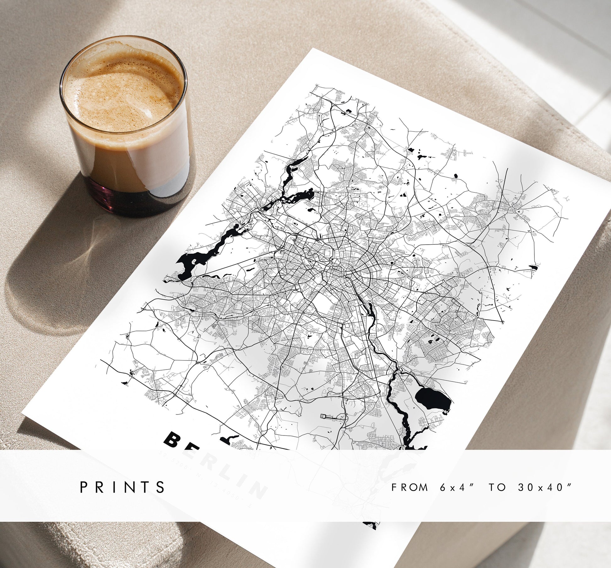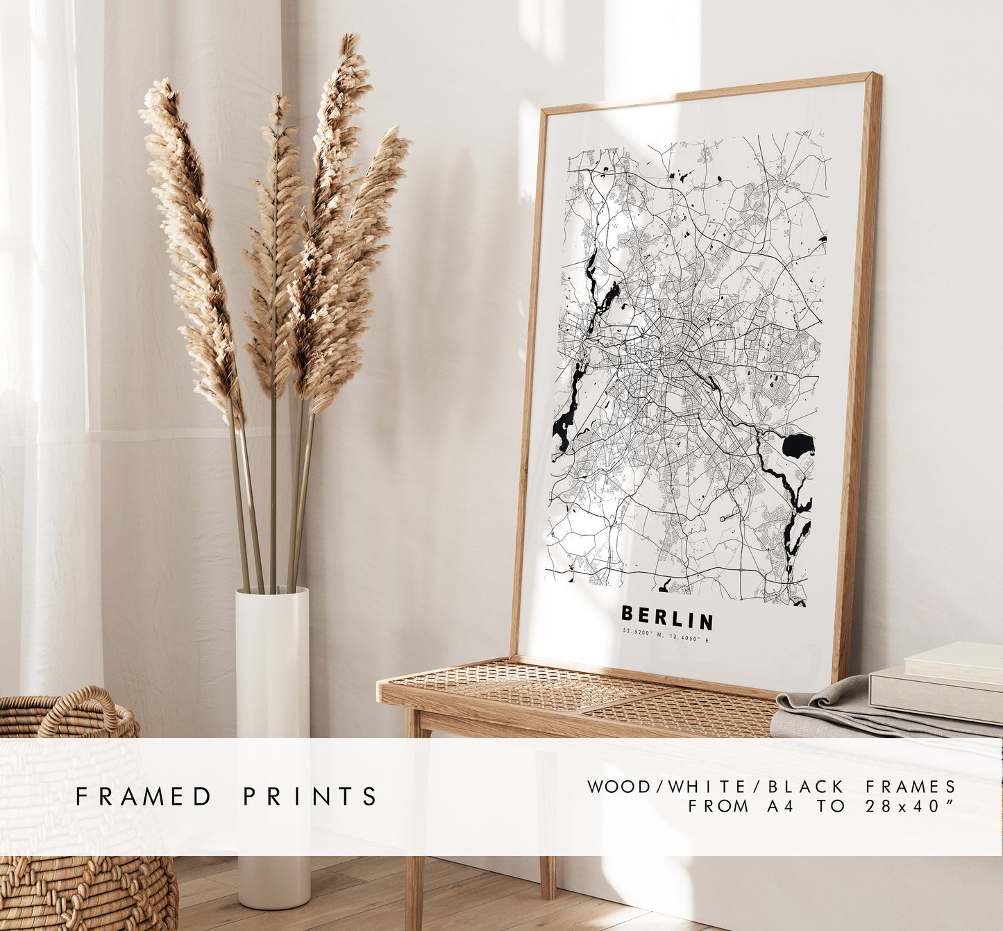 Map print in a minimalist black/white style or choose from a range of colours. These maps look great as a feature piece or as part of a set over a statement piece of furniture.