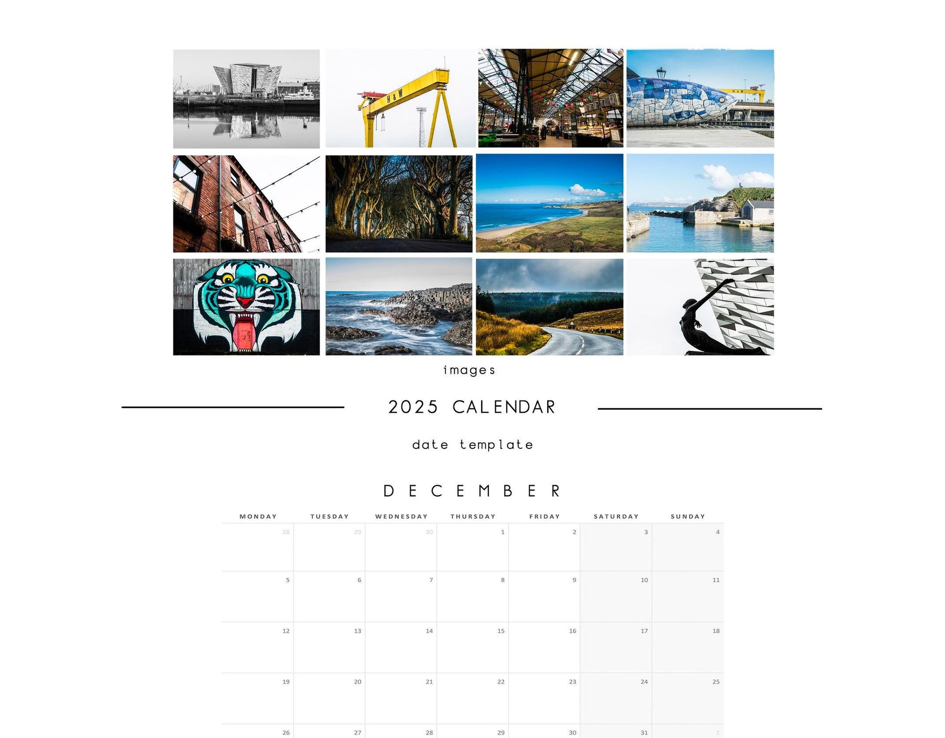 Each month features a wide image (see examples) above our modern, minimalist date template design, which has space for small notes under each date. All of our calendars are made to order and not mass produced.
