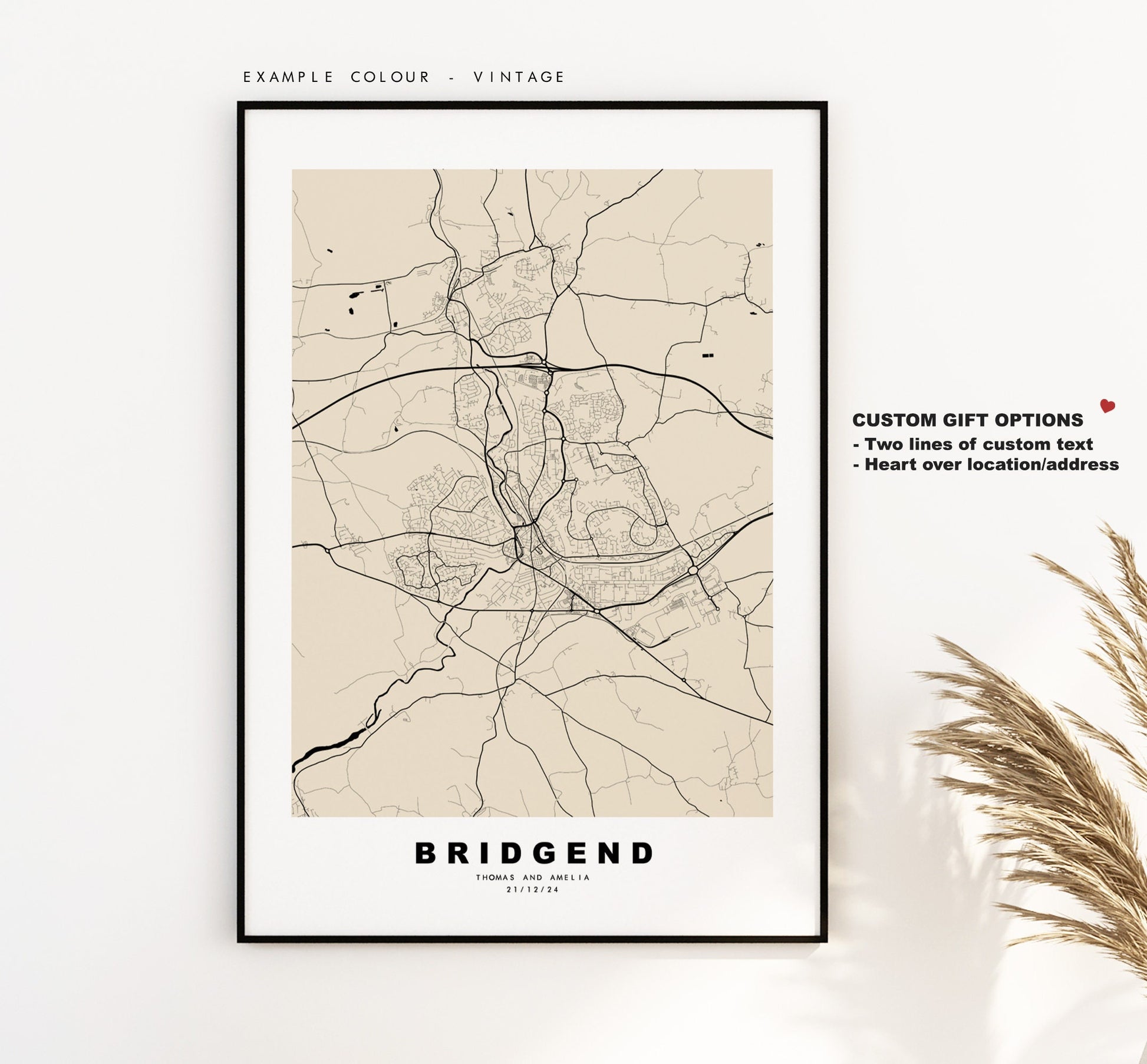 Bridgend map in a minimalist black/white style or choose from a range of colours. These maps look great as a feature piece or as part of a set over a statement piece of furniture. You can personalise this print by adding up to two lines of custom text beneath the city title, or by adding a heart over a location or address.