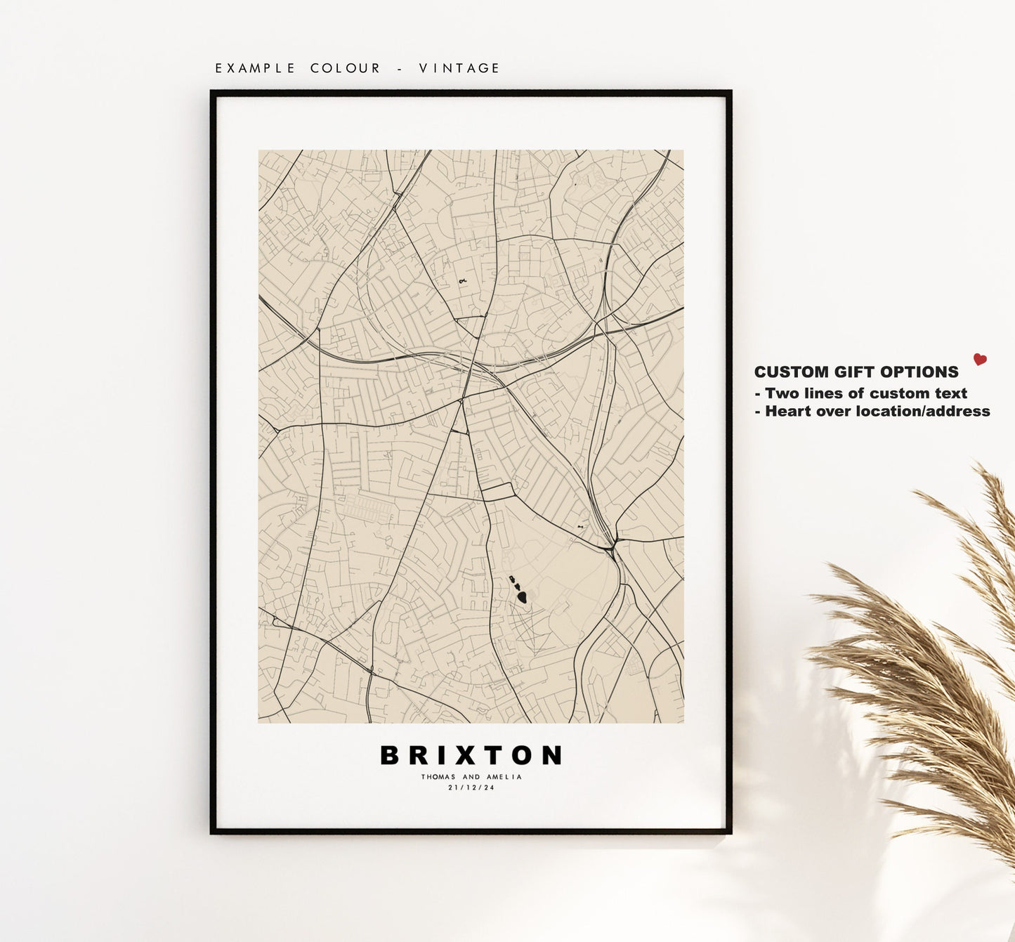 Brixton map in a minimalist black/white style or choose from a range of colours. These maps look great as a feature piece or as part of a set over a statement piece of furniture. You can personalise this print by adding up to two lines of custom text beneath the city title, or by adding a heart over a location or address.