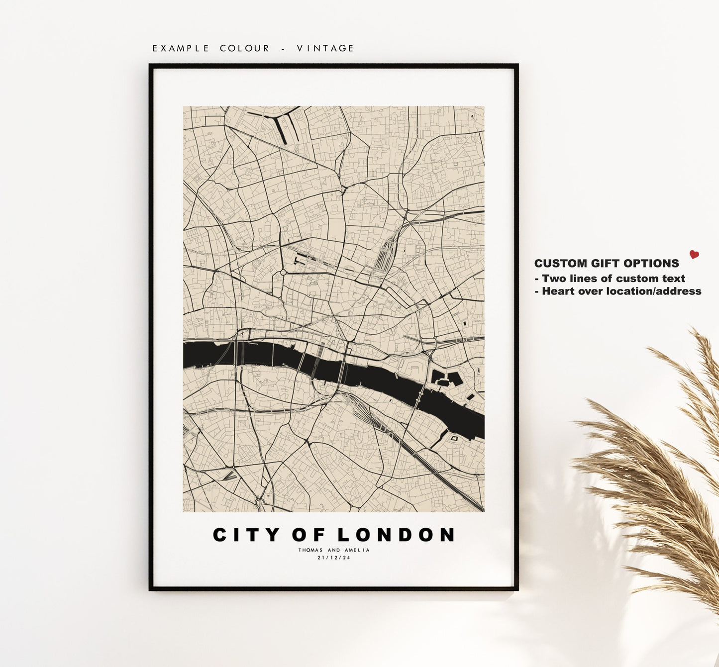 City of London map in a minimalist black/white style or choose from a range of colours. These maps look great as a feature piece or as part of a set over a statement piece of furniture. You can personalise this print by adding up to two lines of custom text beneath the city title, or by adding a heart over a location or address.