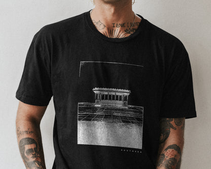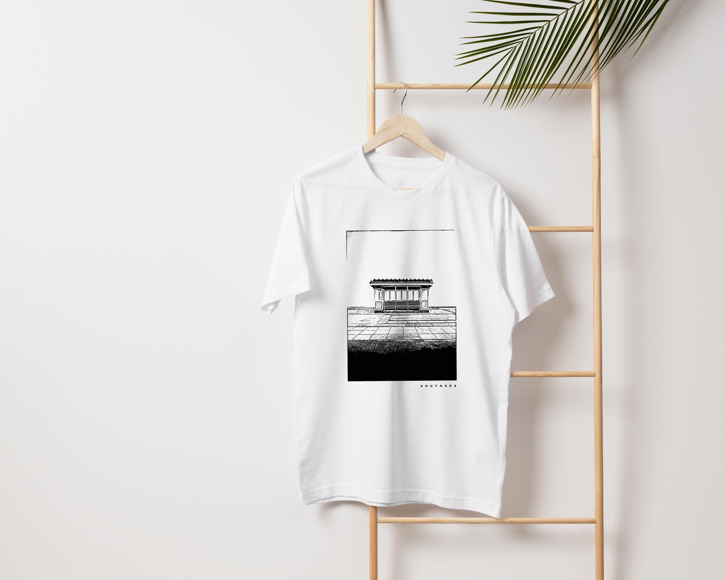 Southsea Sketch Tee, available in white, black or grey. This sketched tee is based on an original photograph taken by us of the famous beach shelters. This tee features a minimalist design and is available on either a classic crewneck or our premium ring-spun cotton crewneck, both available either in Mens or Women's fits.