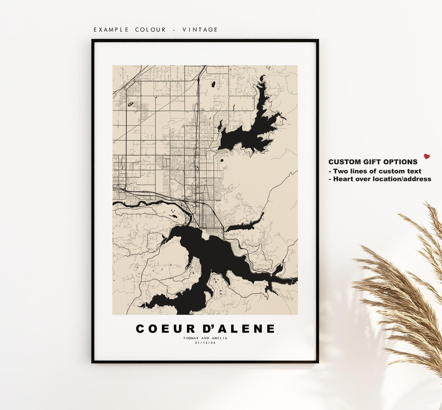 You can personalise this print by adding up to two lines of custom text beneath the city title, or by adding a heart over a location or address.