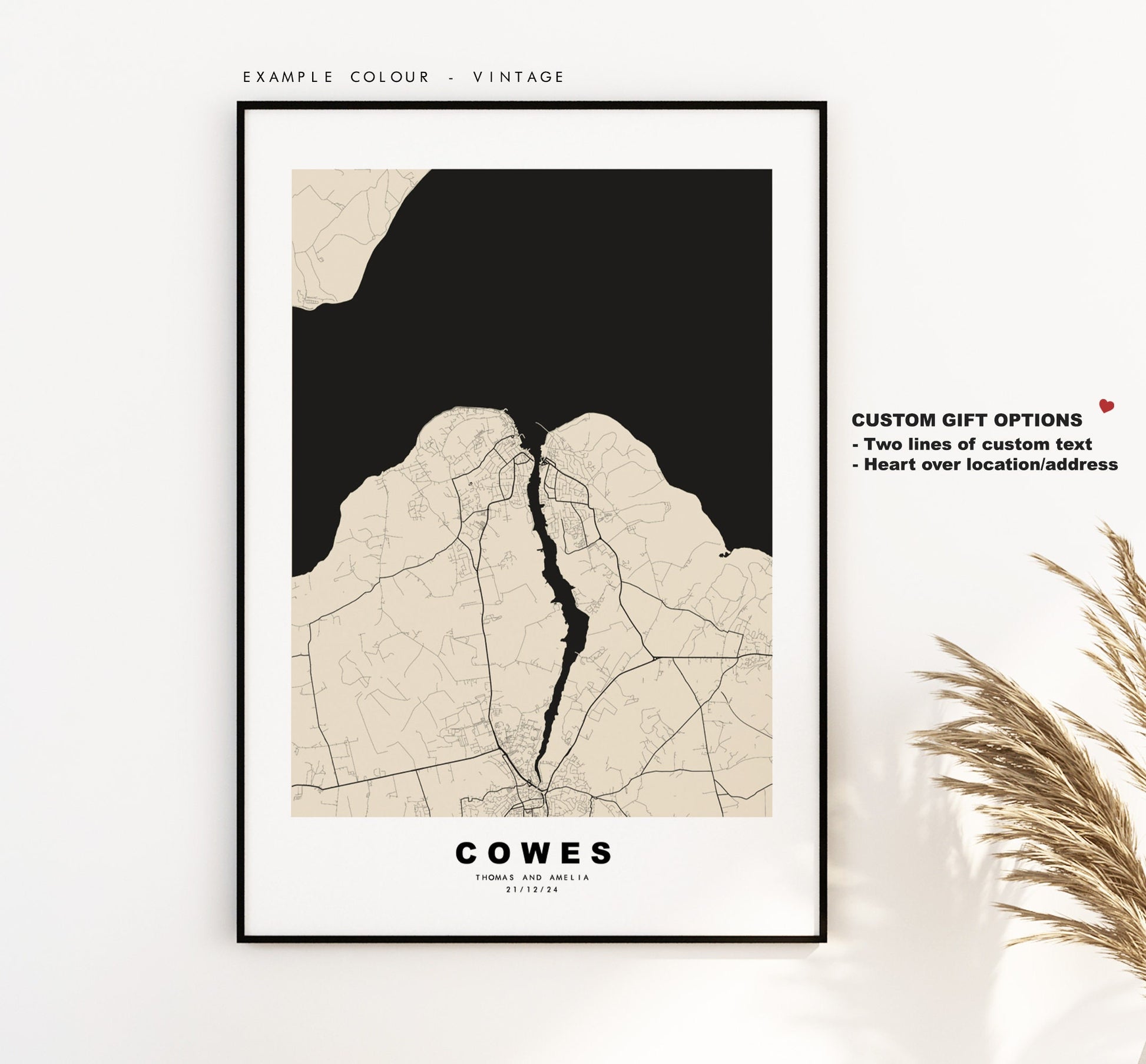 Cowes map in a minimalist black/white style or choose from a range of colours. These maps look great as a feature piece or as part of a set over a statement piece of furniture. You can personalise this print by adding up to two lines of custom text beneath the city title, or by adding a heart over a location or address.