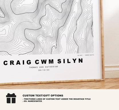 Craig Cym Silyn contour map in a minimalist style, available in classic white/black or in a choice of map colours (see listing images). These contour maps are very detailed, with height markers at 200m intervals and the summit marked where possible - so the larger size the better!