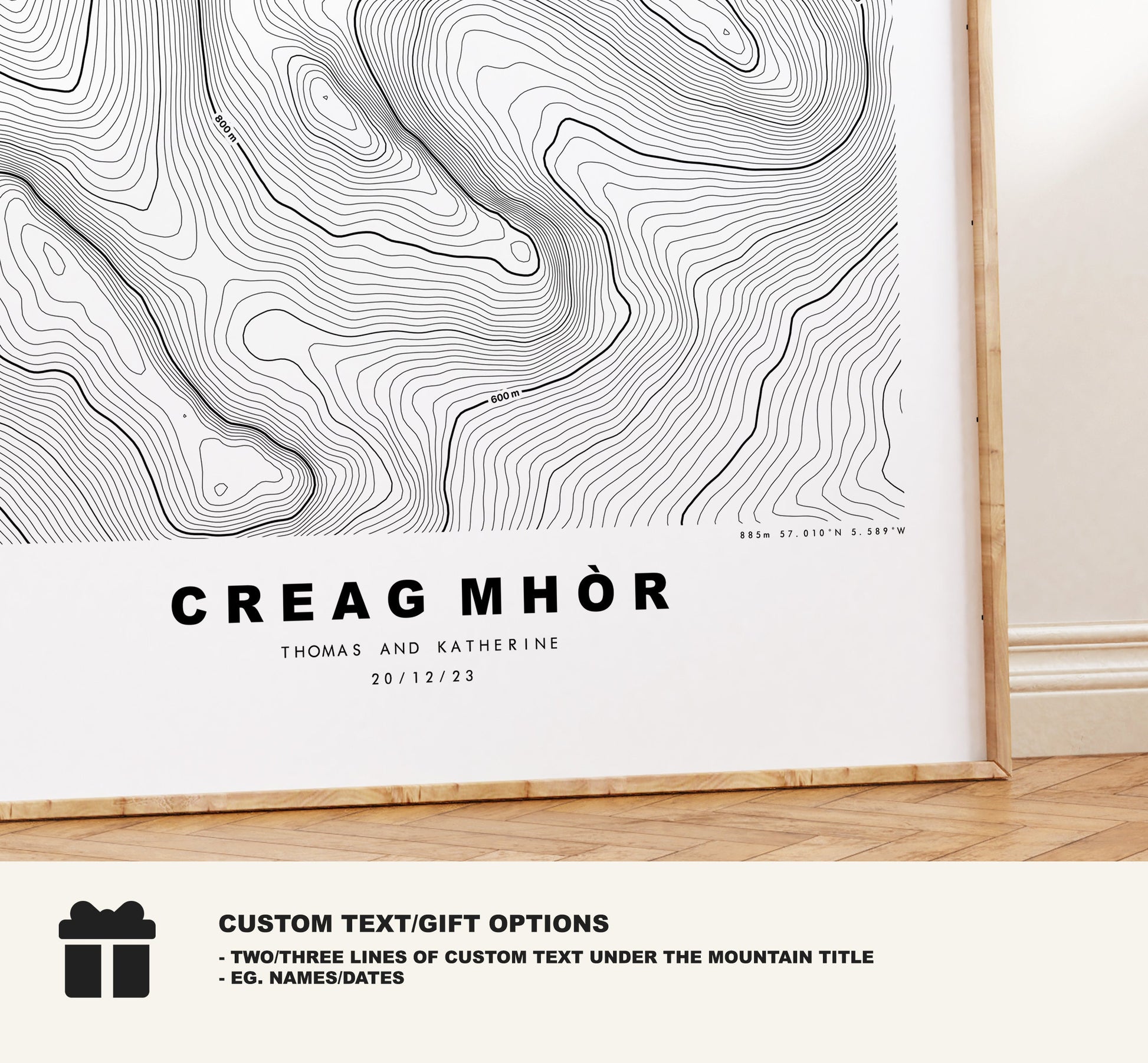 Creag Mhor contour map in a minimalist style, available in classic white/black or in a choice of map colours (see listing images). These contour maps are very detailed, with height markers at 200m intervals and the summit marked where possible - so the larger size the better!