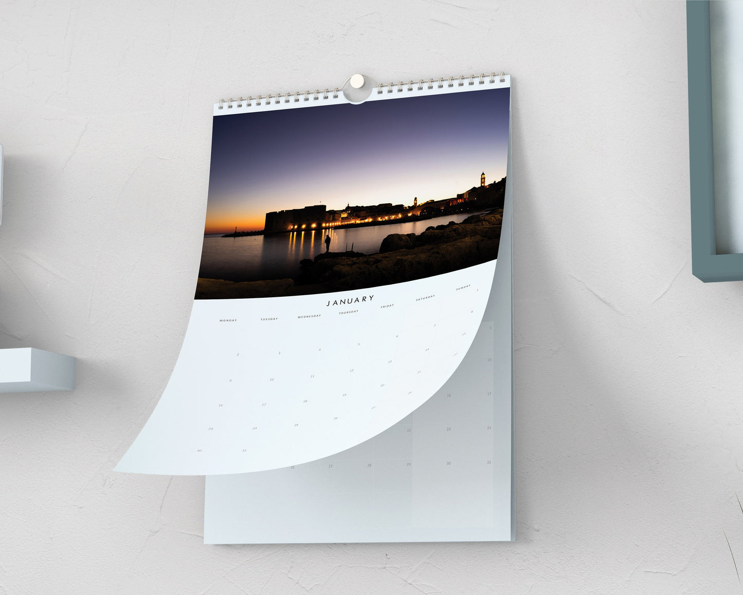 Each month features a wide image (see examples) above our modern, minimalist date template design, which has space for small notes under each date. All of our calendars are made to order and not mass produced.