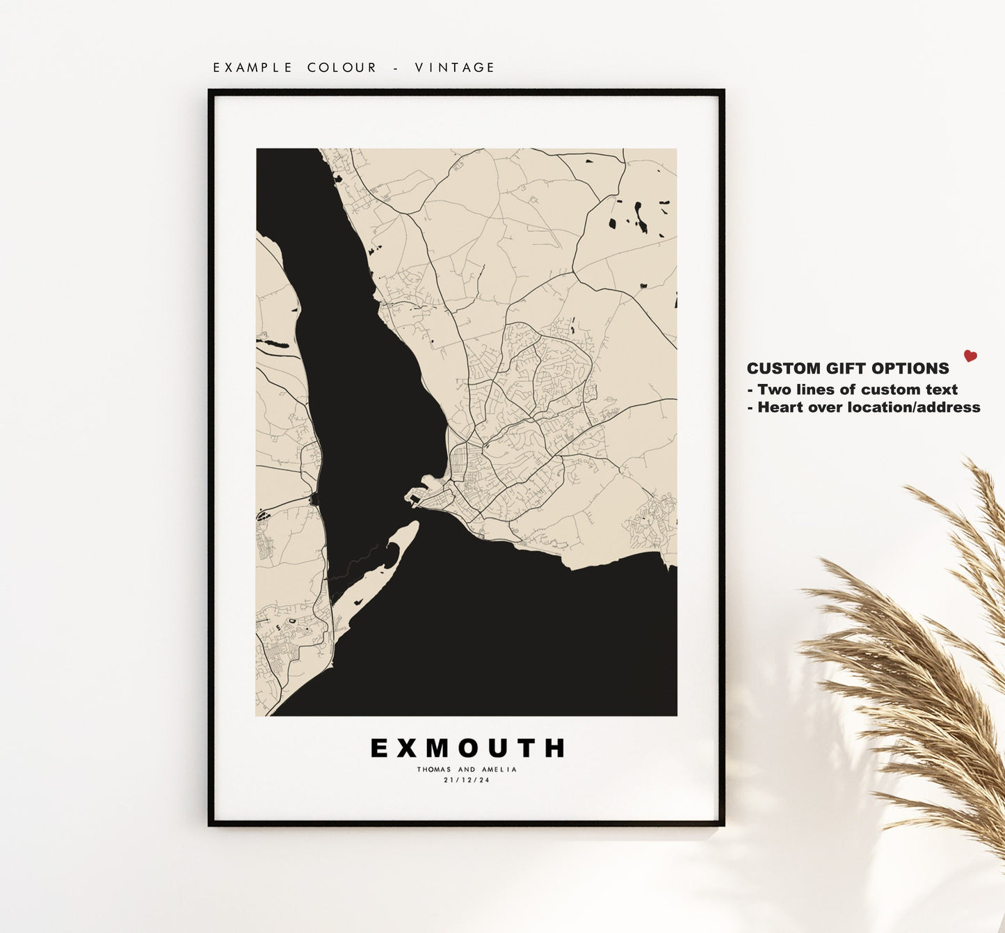 Exmouth map in a minimalist black/white style or choose from a range of colours. These maps look great as a feature piece or as part of a set over a statement piece of furniture. You can personalise this print by adding up to two lines of custom text beneath the city title, or by adding a heart over a location or address.