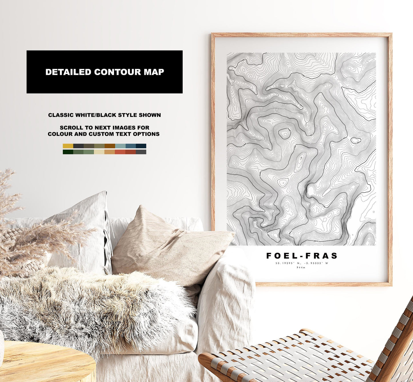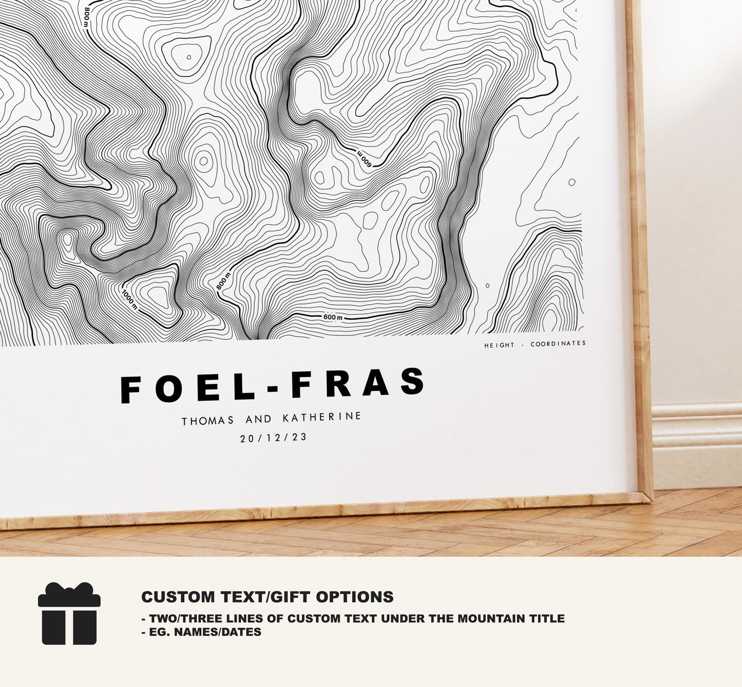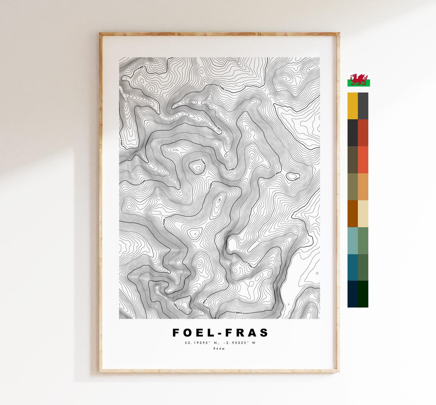 Foel-Fras contour map in a minimalist style, available in classic white/black or in a choice of map colours (see listing images). These contour maps are very detailed, with height markers at 200m intervals and the summit marked where possible - so the larger size the better!