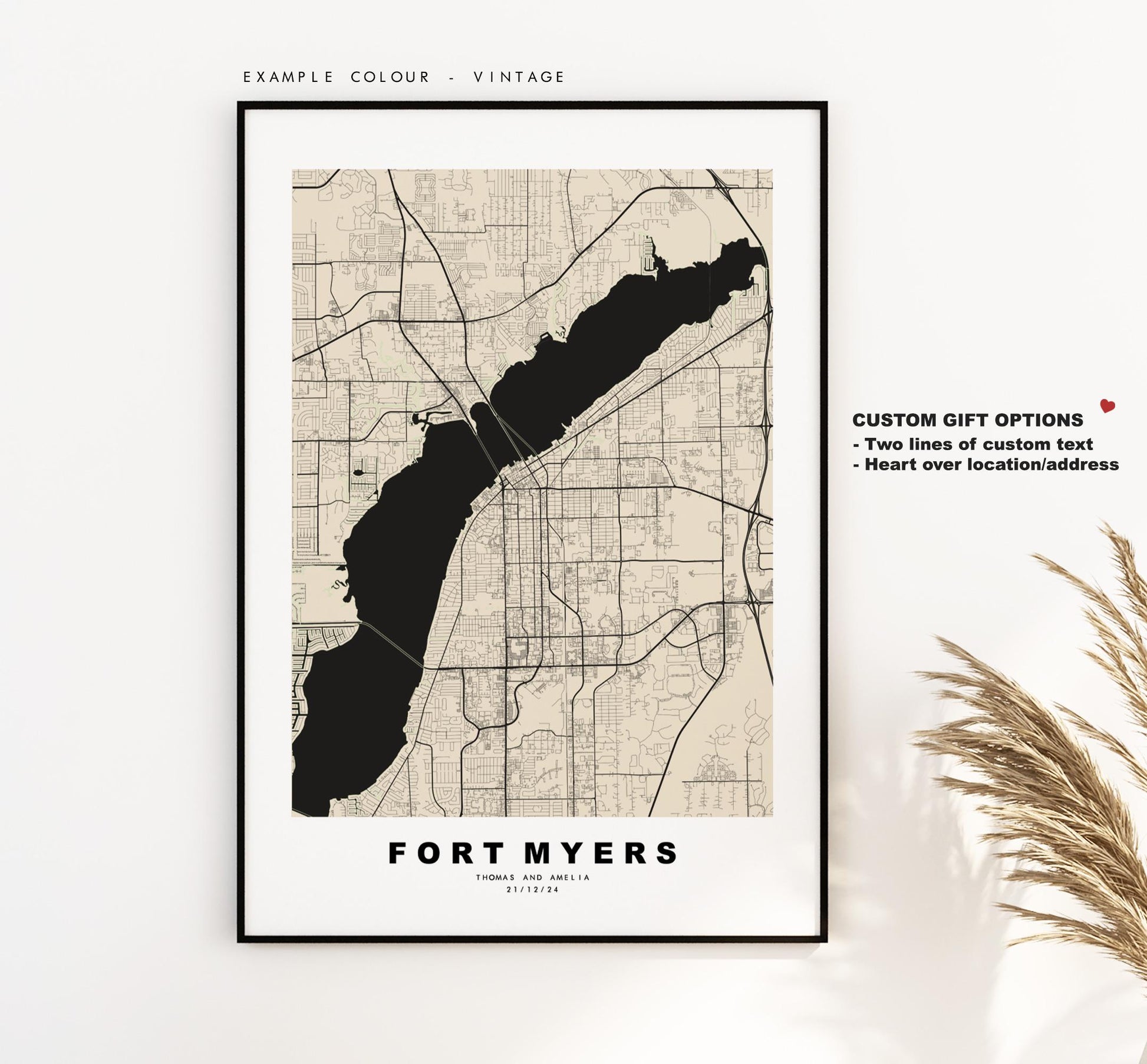 You can personalise this print by adding up to two lines of custom text beneath the city title, or by adding a heart over a location or address.