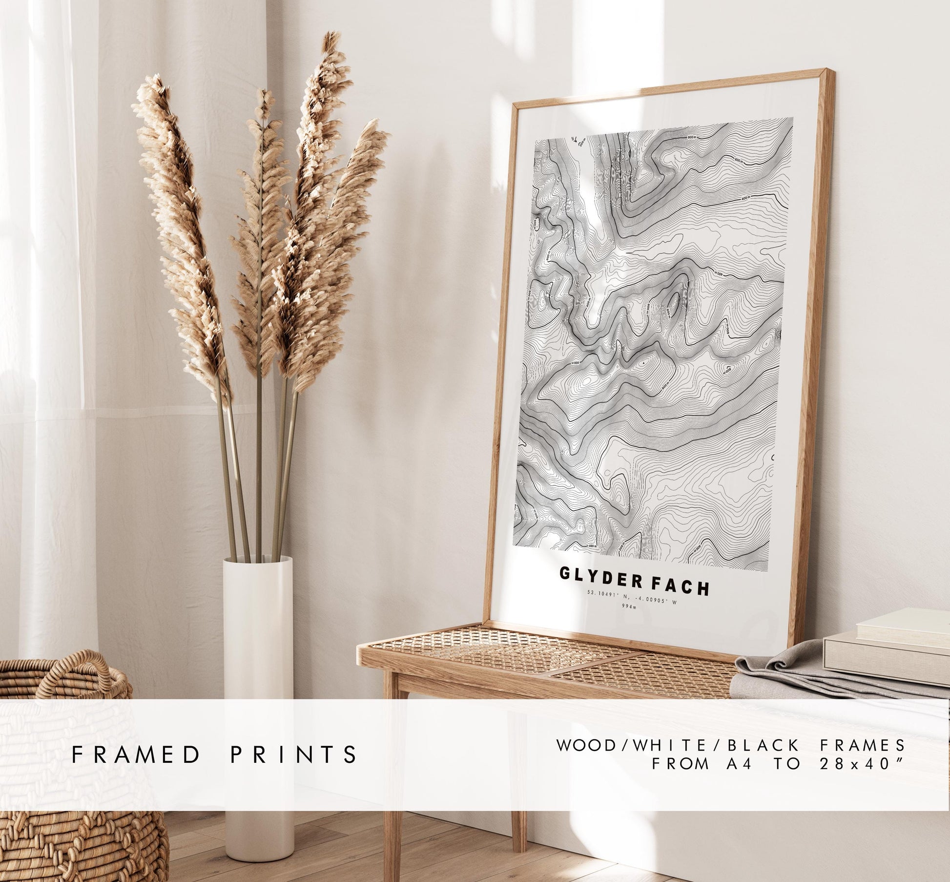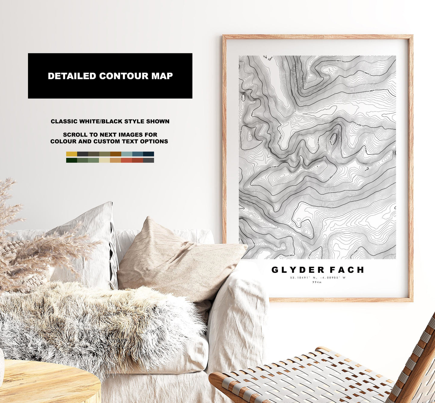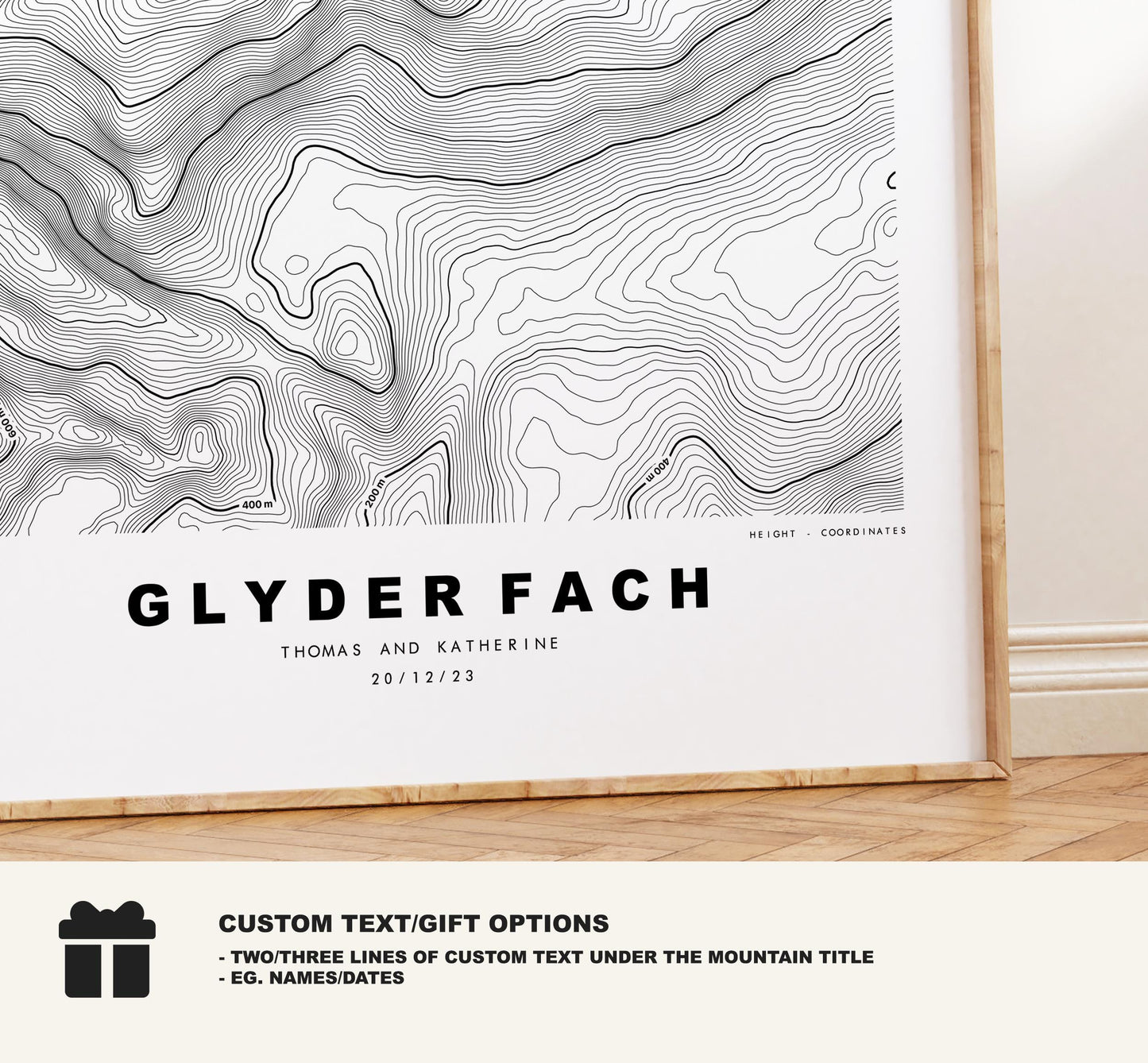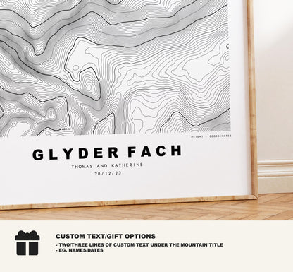 Glyder Fach contour map in a minimalist style, available in classic white/black or in a choice of map colours (see listing images). These contour maps are very detailed, with height markers at 200m intervals and the summit marked where possible - so the larger size the better!