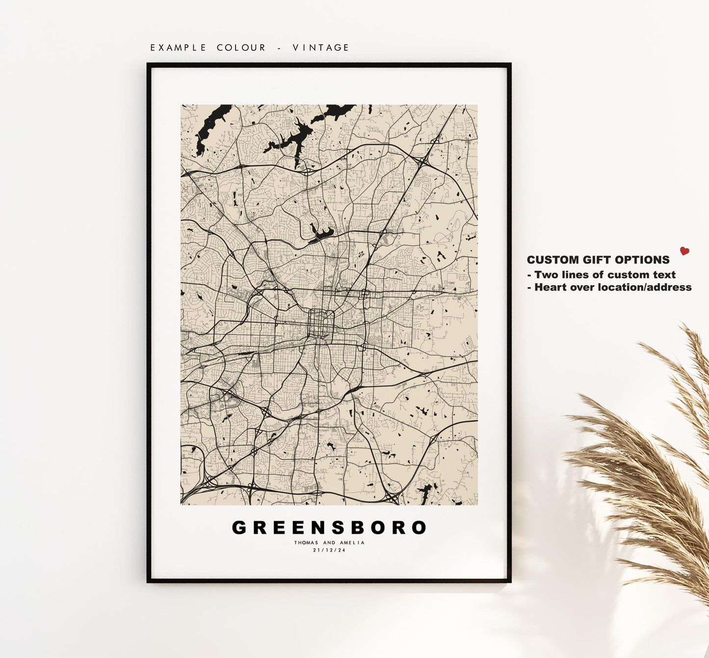 You can personalise this print by adding up to two lines of custom text beneath the city title, or by adding a heart over a location or address.