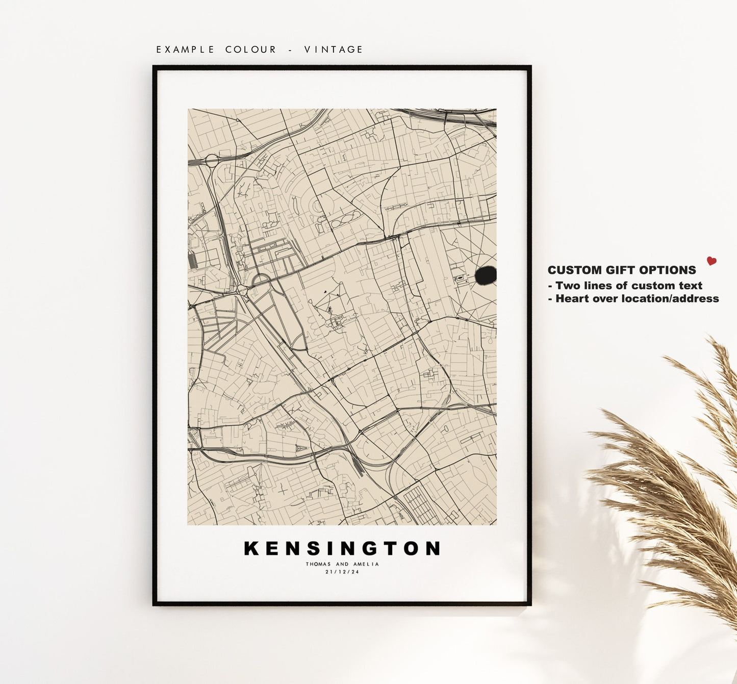 Kensington map in a minimalist black/white style or choose from a range of colours. These maps look great as a feature piece or as part of a set over a statement piece of furniture. You can personalise this print by adding up to two lines of custom text beneath the city title, or by adding a heart over a location or address.