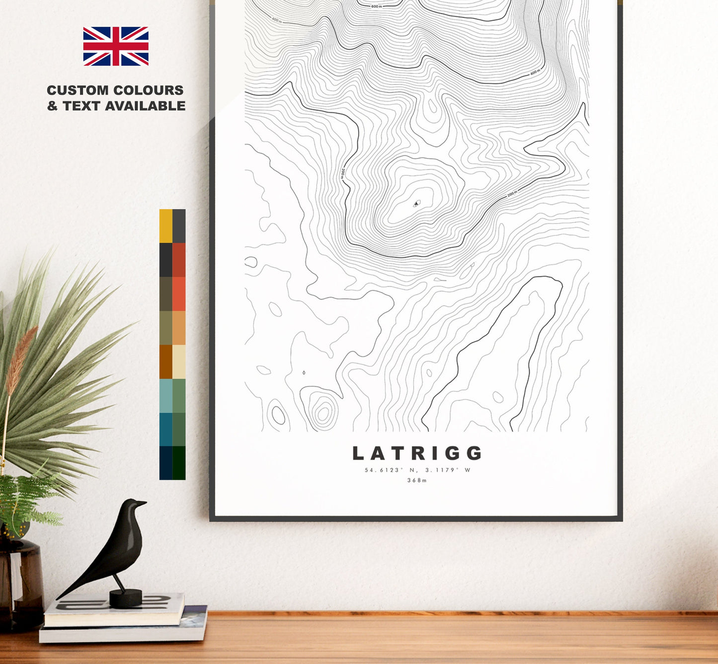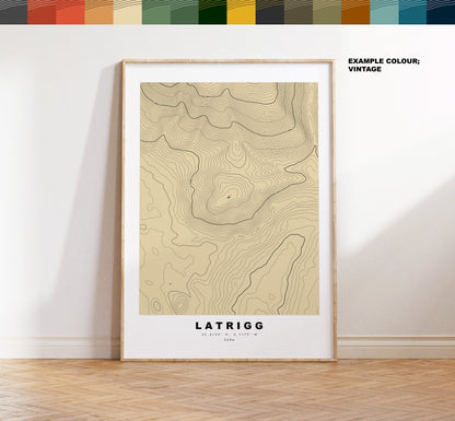 Latrigg contour map in a minimalist style, available in classic white/black or in a choice of map colours (see listing images). These contour maps are very detailed, with height markers at 200m intervals and the summit marked where possible - so the larger size the better!