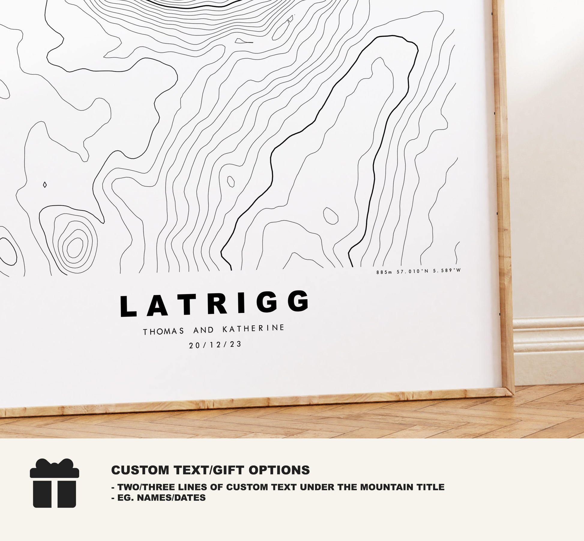These maps can be customised with two/three lines of text which replaces the coordinates at the bottom of the print. Perfect to mark a special occasion or for a personalised gift! See personalisation option box for more details.