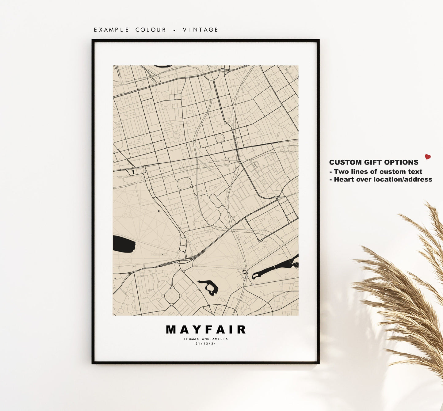 Mayfair map in a minimalist black/white style or choose from a range of colours. These maps look great as a feature piece or as part of a set over a statement piece of furniture. You can personalise this print by adding up to two lines of custom text beneath the city title, or by adding a heart over a location or address.