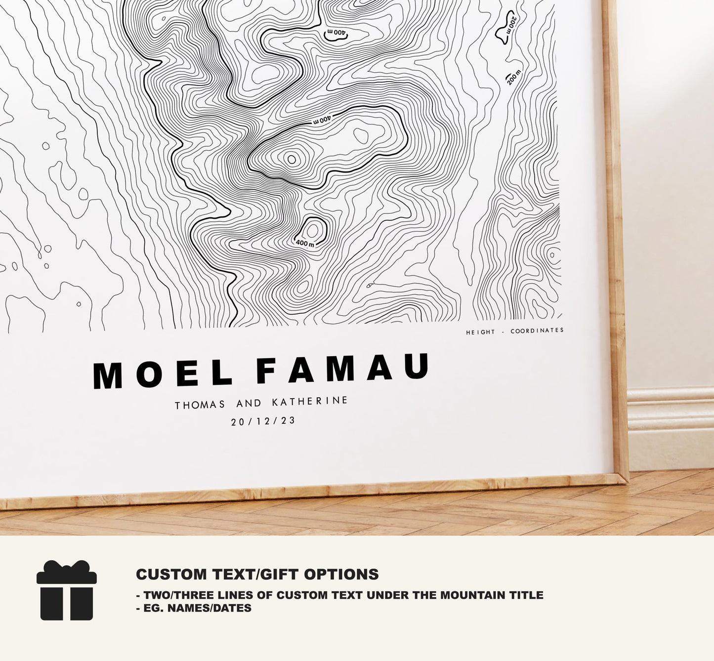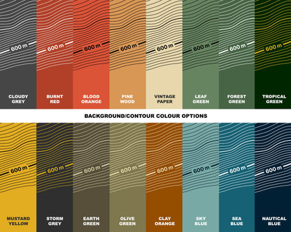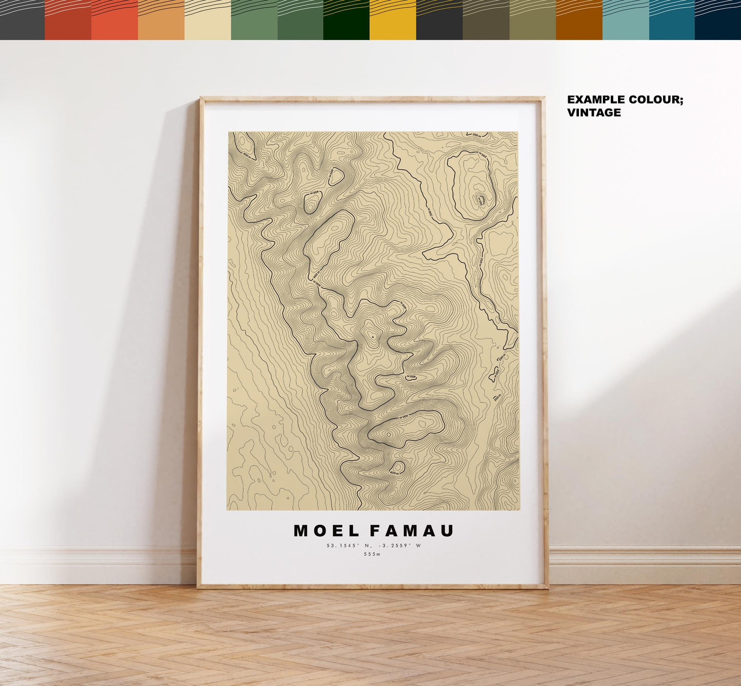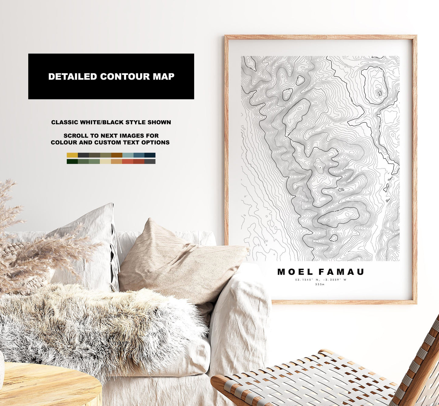 Moel Famau contour map in a minimalist style, available in classic white/black or in a choice of map colours (see listing images). These contour maps are very detailed, with height markers at 200m intervals and the summit marked where possible - so the larger size the better!