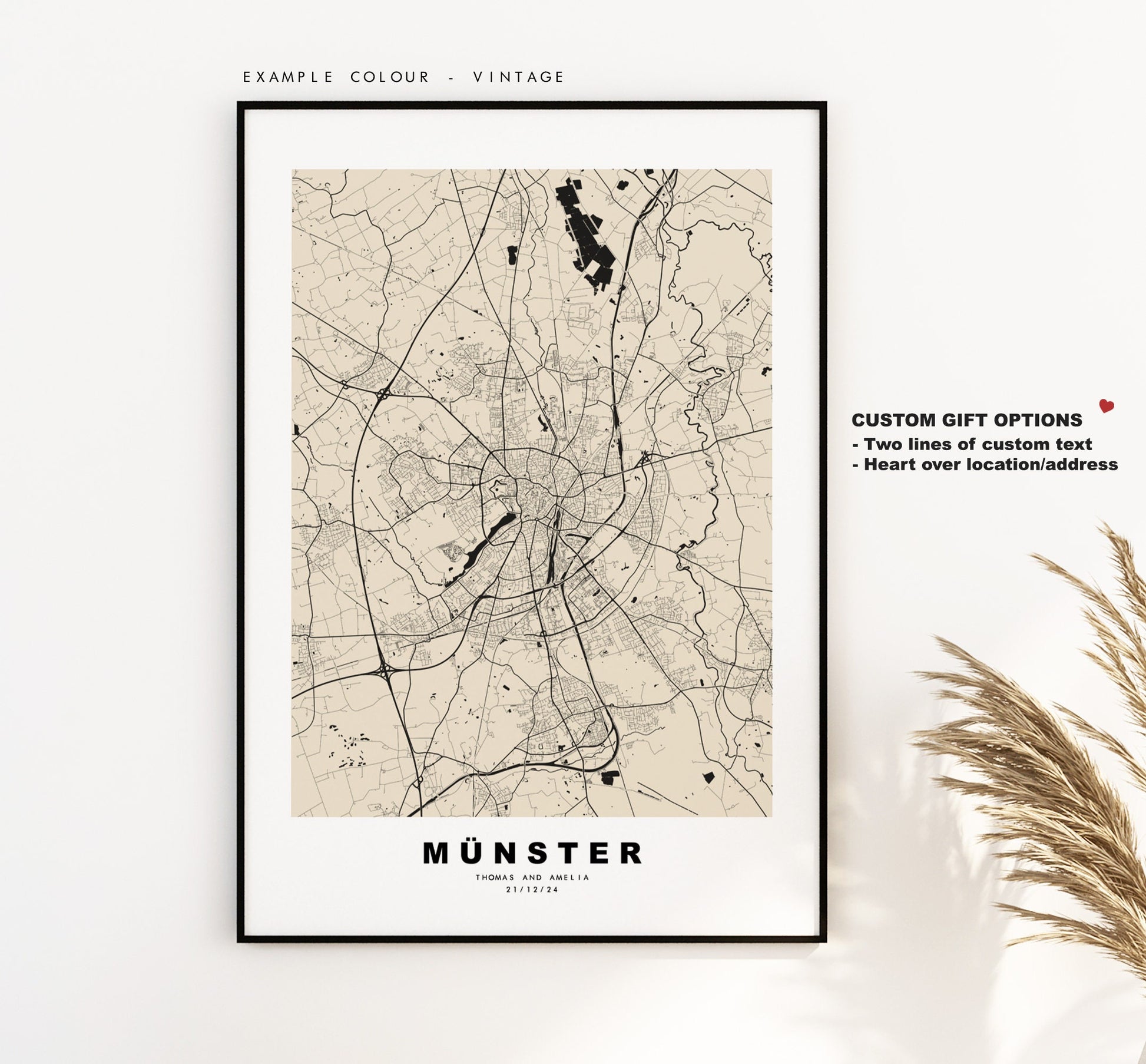 You can personalise this print by adding up to two lines of custom text beneath the city title, or by adding a heart over a location or address.