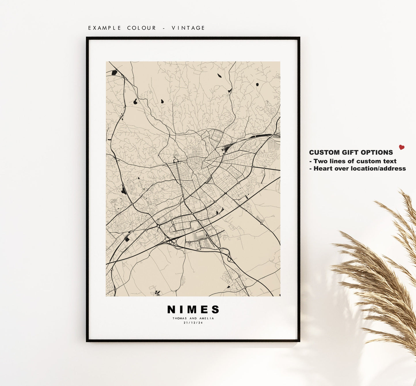 You can personalise this print by adding up to two lines of custom text beneath the city title, or by adding a heart over a location or address.