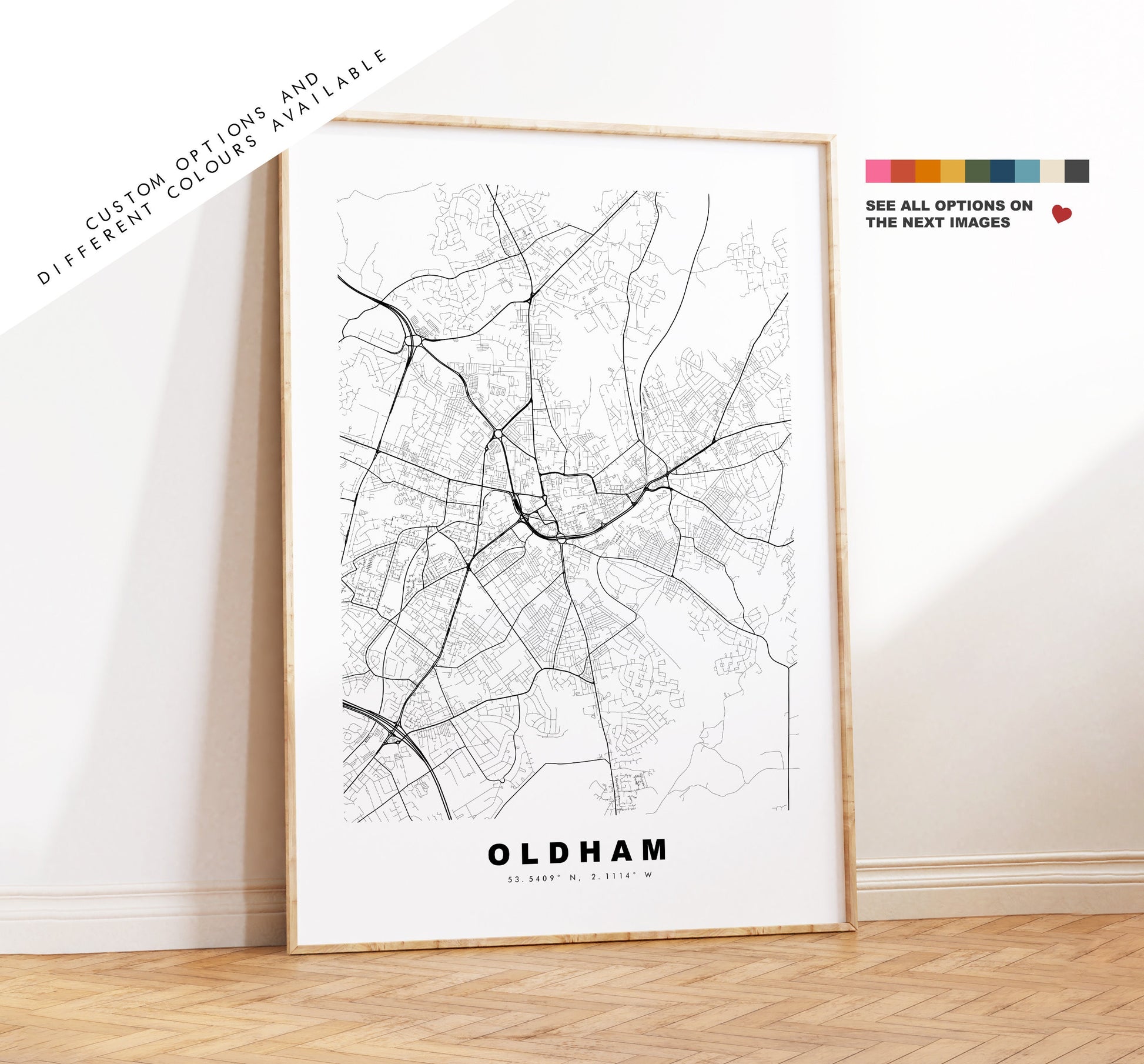 Oldham map in a minimalist black/white style or choose from a range of colours. These maps look great as a feature piece or as part of a set over a statement piece of furniture. You can personalise this print by adding up to two lines of custom text beneath the city title, or by adding a heart over a location or address.