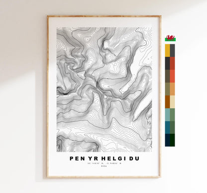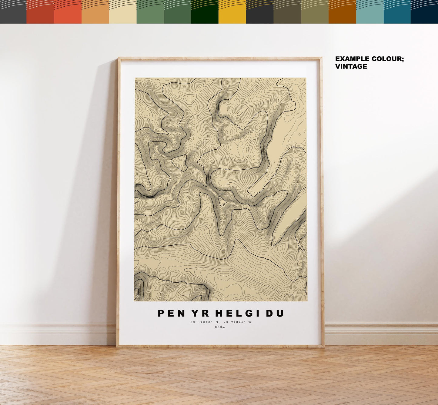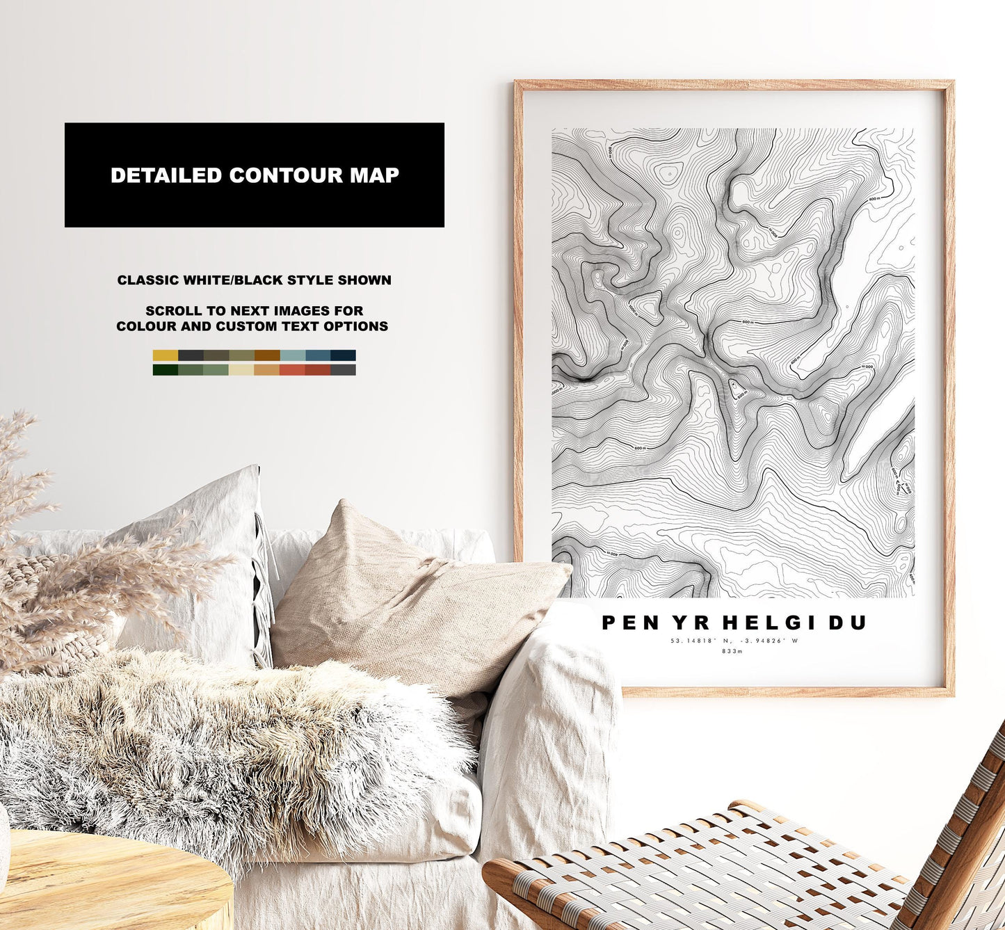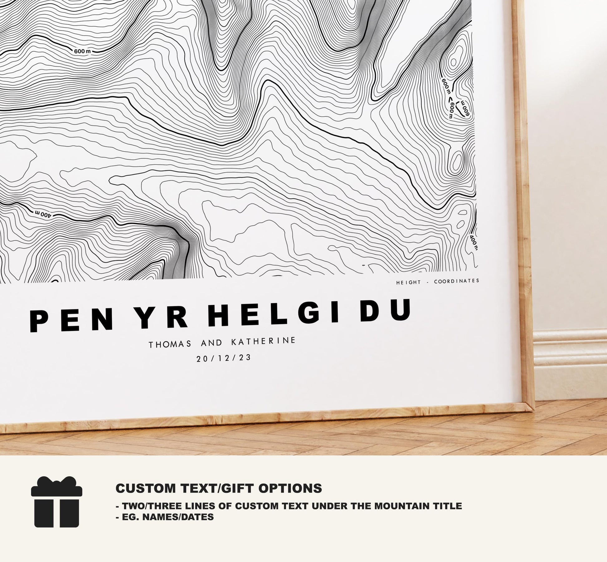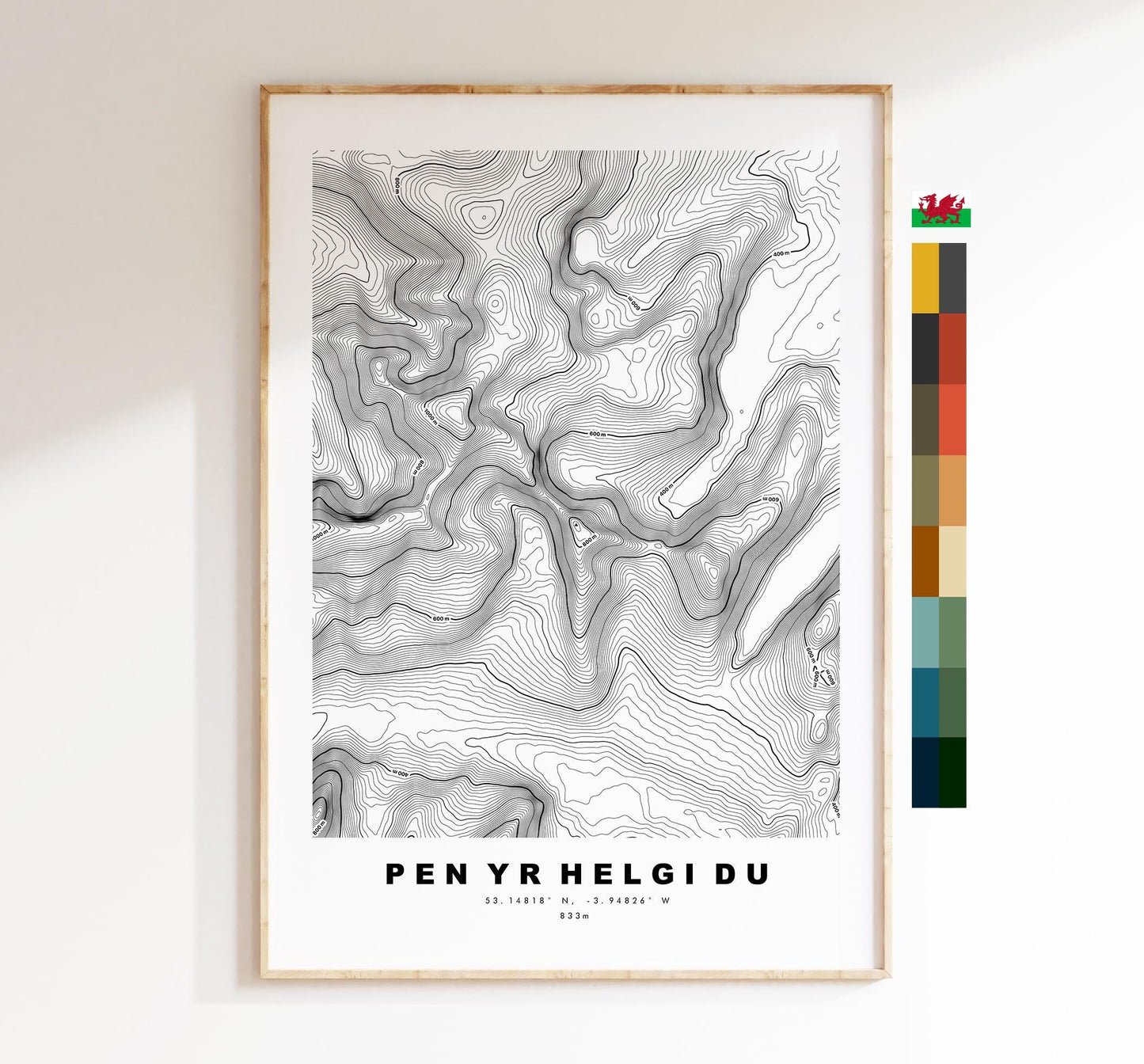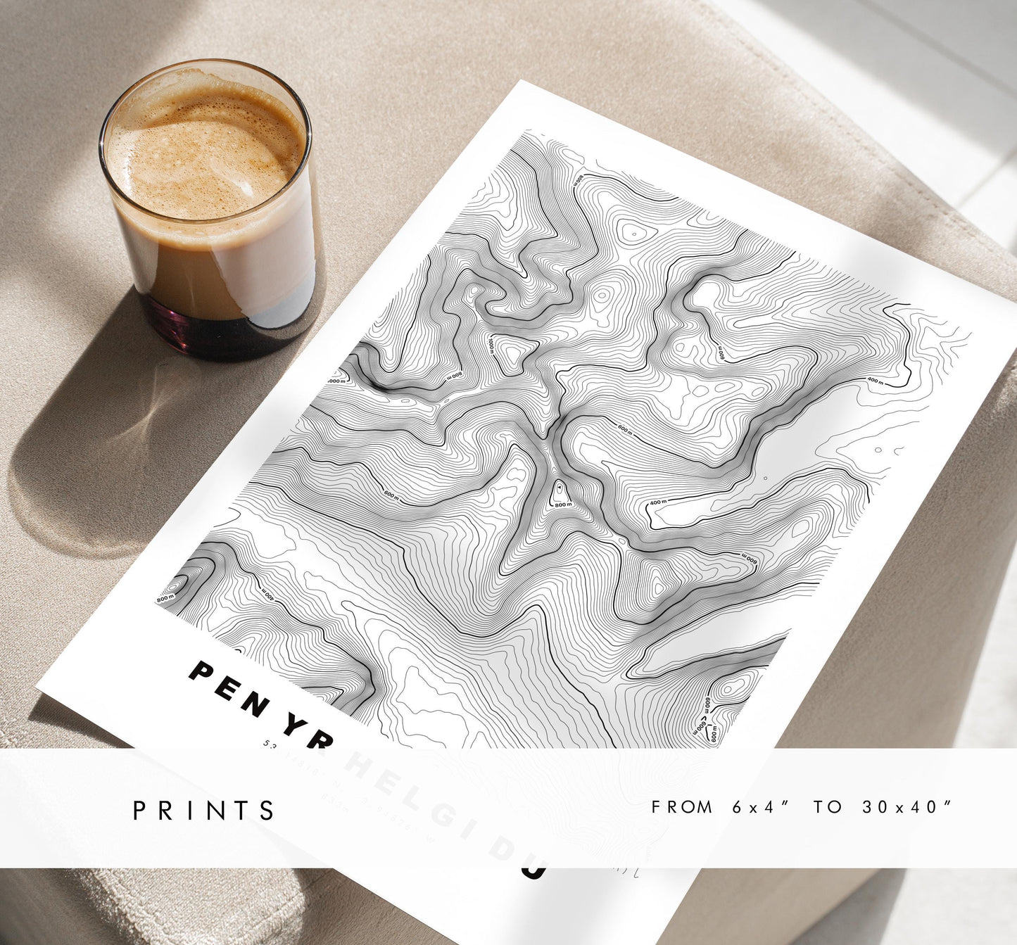 Pen Yr Helgi Du contour map in a minimalist style, available in classic white/black or in a choice of map colours (see listing images). These contour maps are very detailed, with height markers at 200m intervals and the summit marked where possible - so the larger size the better!