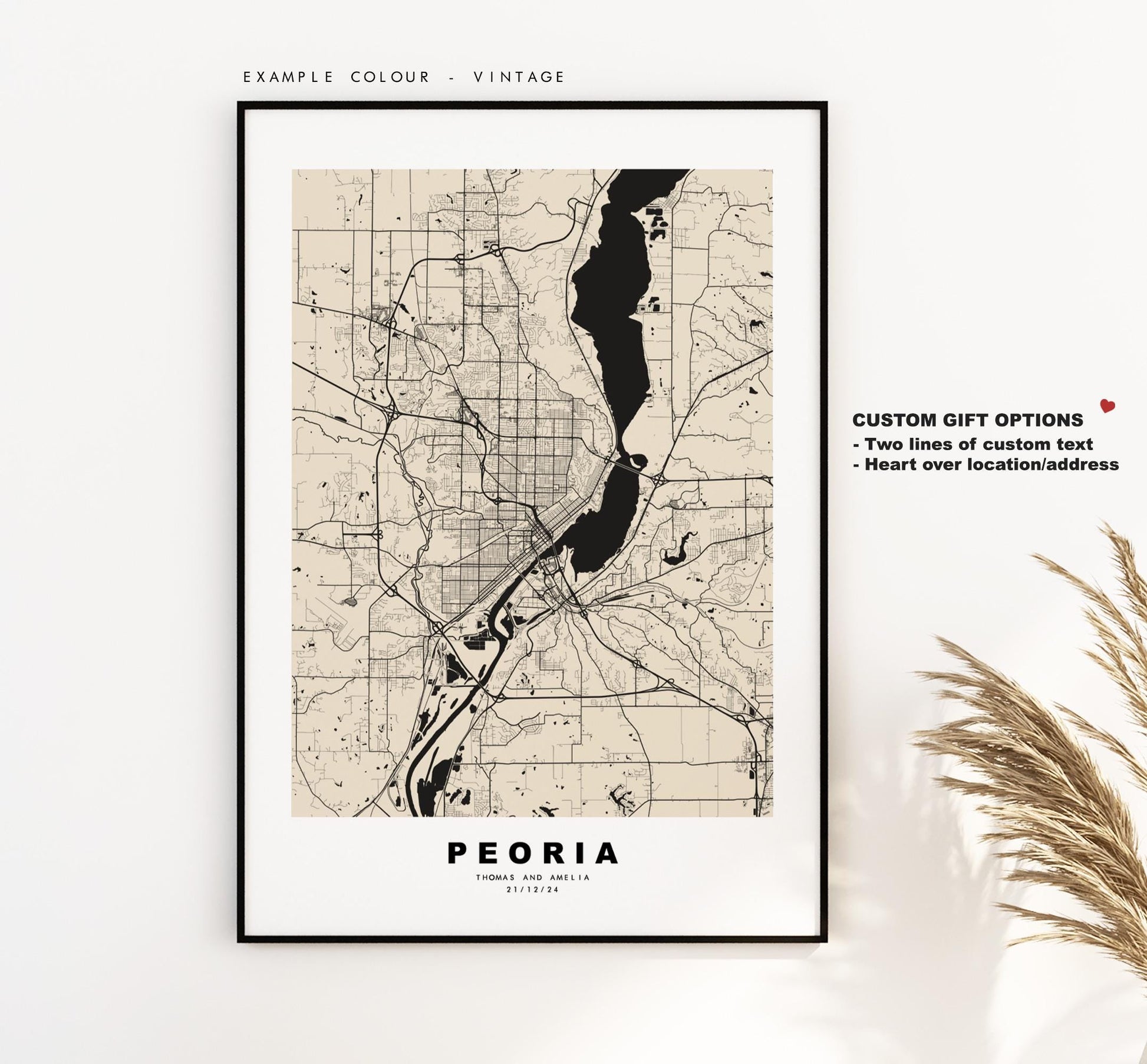 You can personalise this print by adding up to two lines of custom text beneath the city title, or by adding a heart over a location or address.