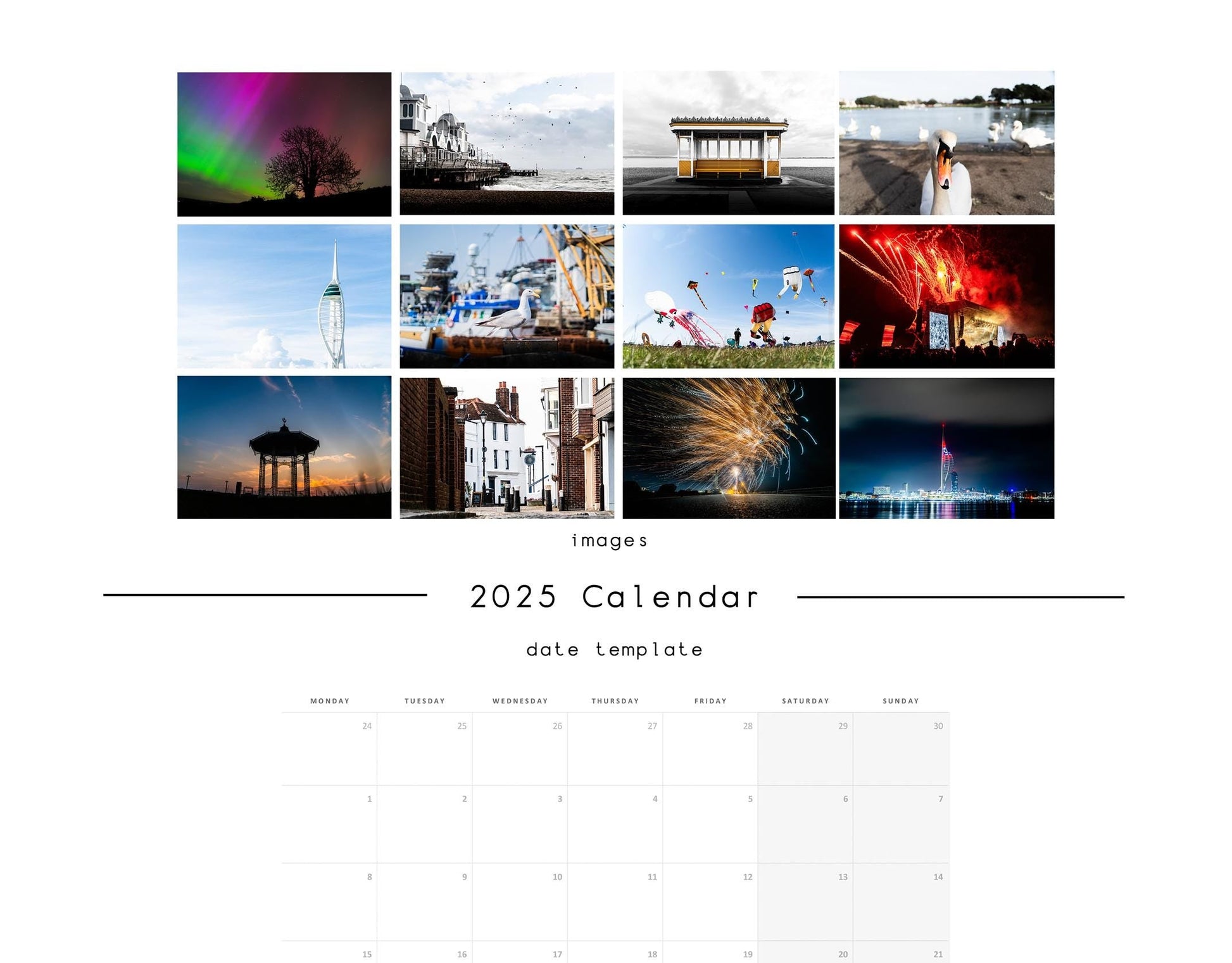Portsmouth 2025 A3 or A4 Wall Calendar, with each month featuring photography taken by us here at Southsea Studio from our Portsmouth and Southsea collection, with most photos taken over the last year. ย All of our other calendars are made to order but every year I stock our Portsmouth Calendar for markets and events running up to Christmas. As such happy to offer this online at the same price I would at the markets, just with shipping added.