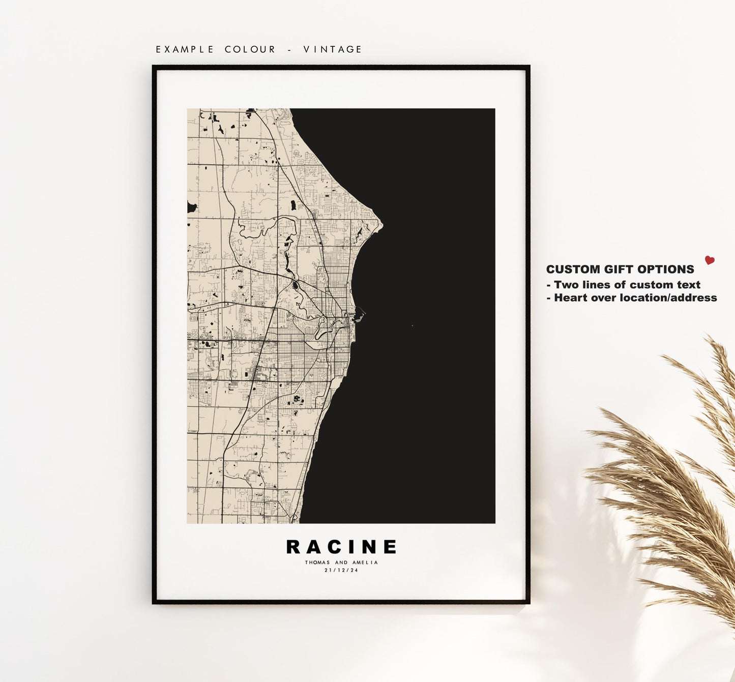 You can personalise this print by adding up to two lines of custom text beneath the city title, or by adding a heart over a location or address.