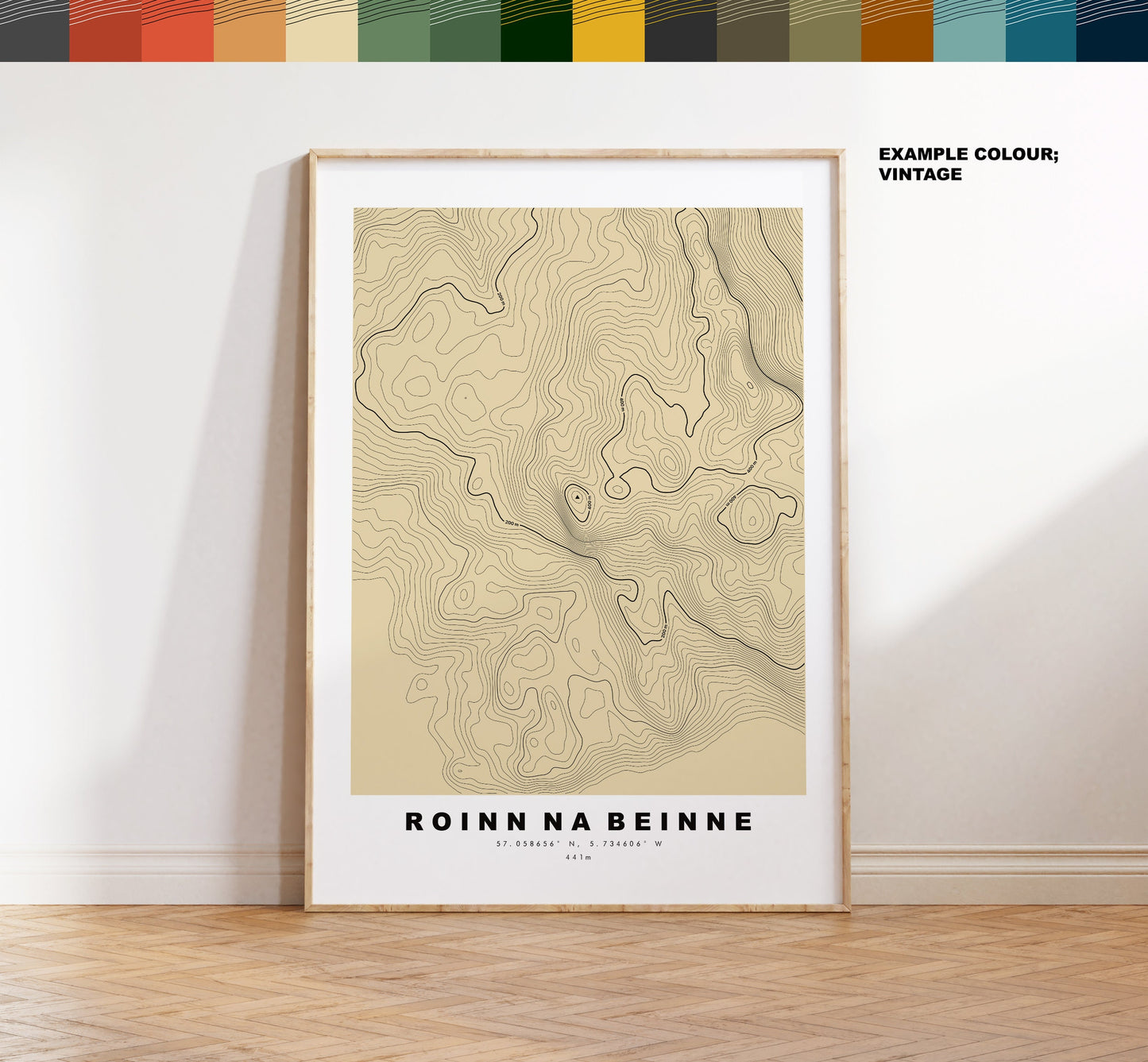 Roinn na Beinne contour map in a minimalist style, available in classic white/black or in a choice of map colours (see listing images). These contour maps are very detailed, with height markers at 200m intervals and the summit marked where possible - so the larger size the better!