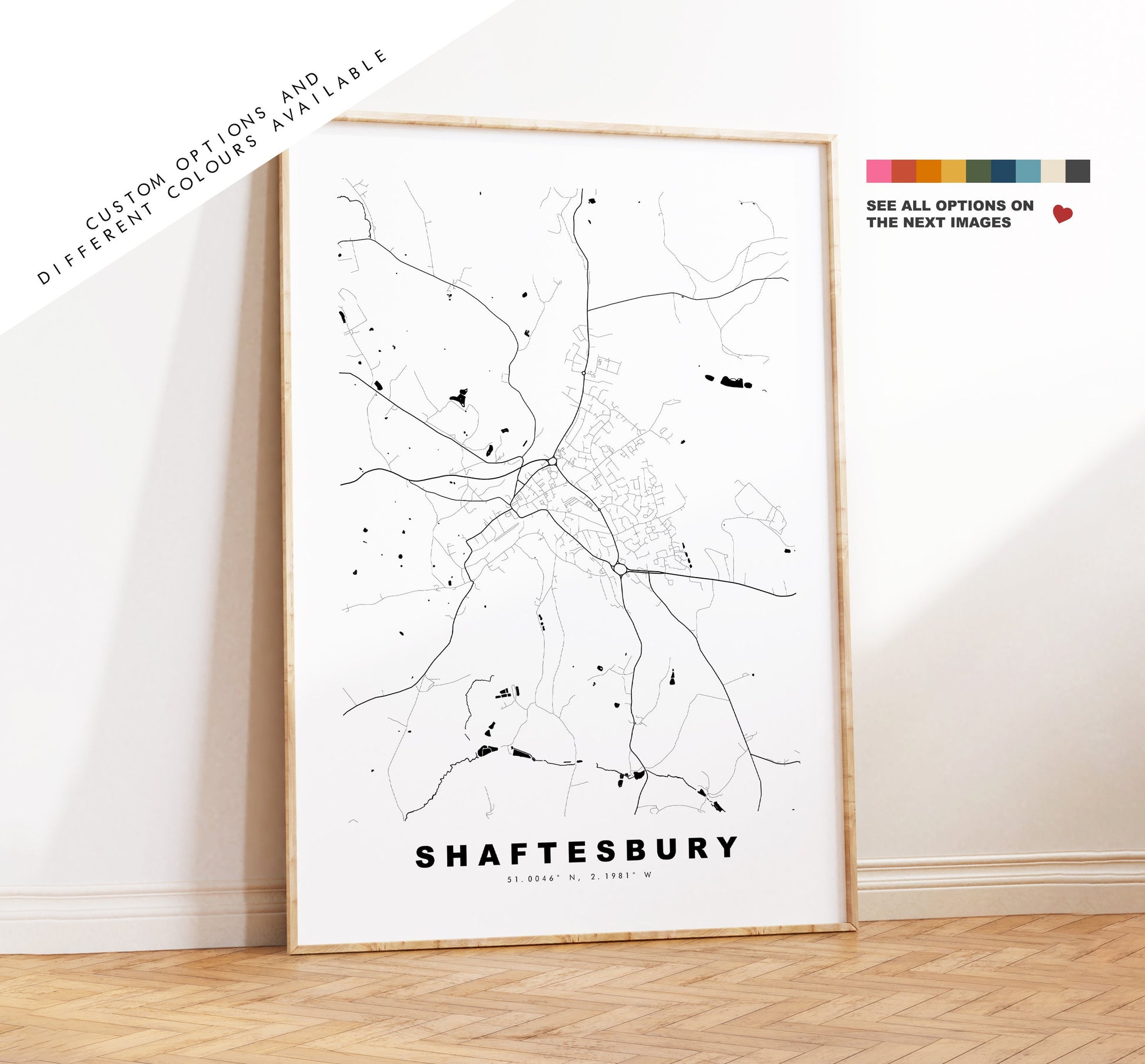 Shaftesbury map in a minimalist black/white style or choose from a range of colours. These maps look great as a feature piece or as part of a set over a statement piece of furniture. You can personalise this print by adding up to two lines of custom text beneath the city title, or by adding a heart over a location or address.