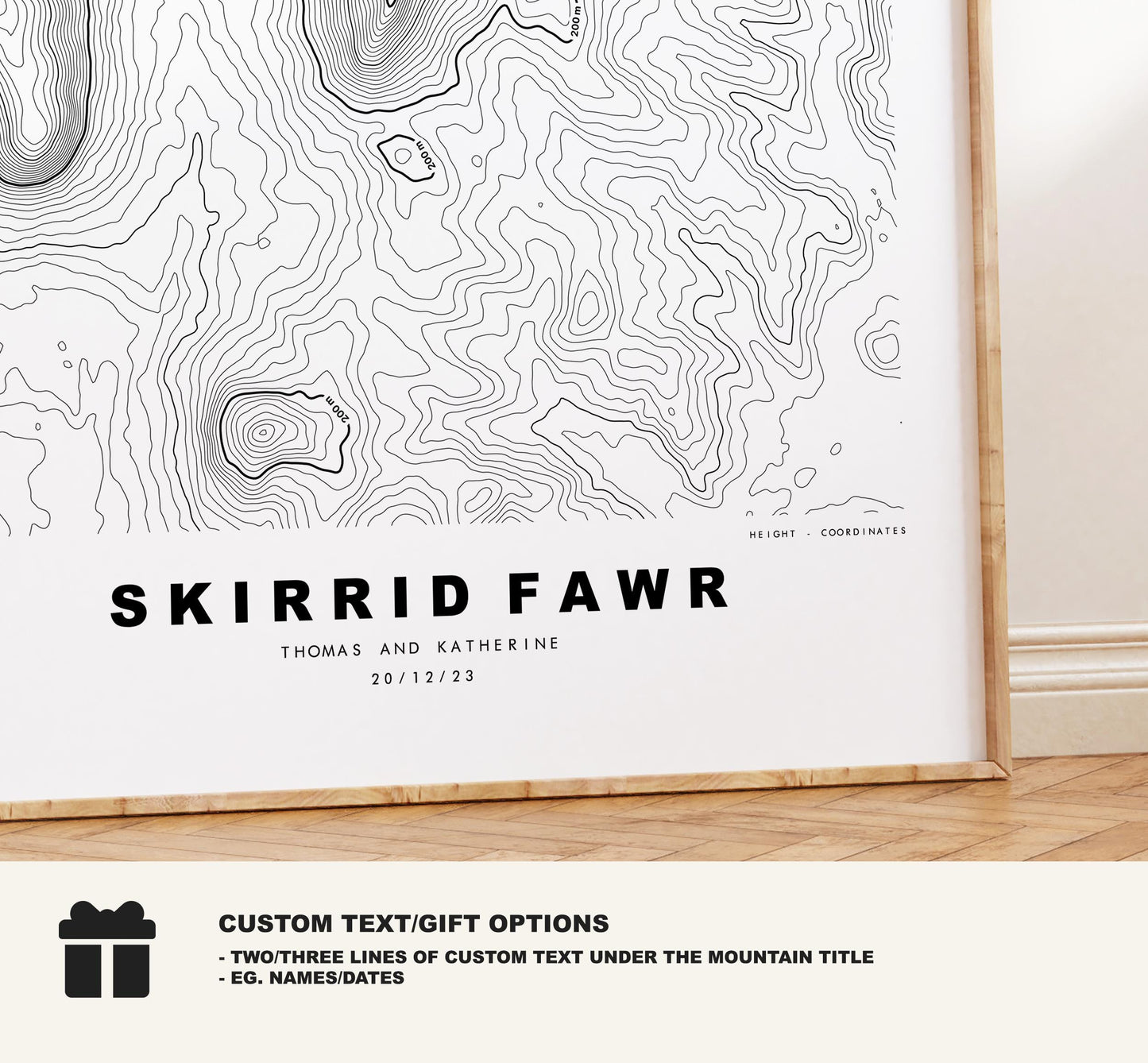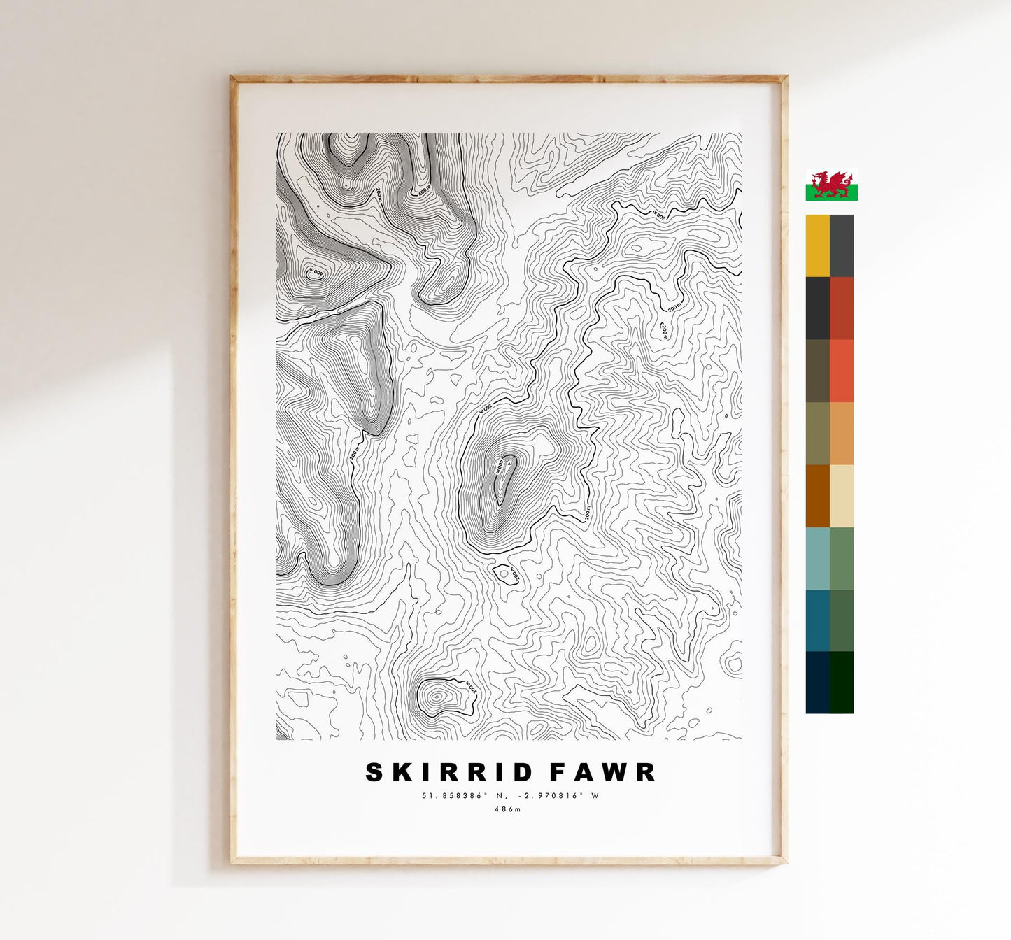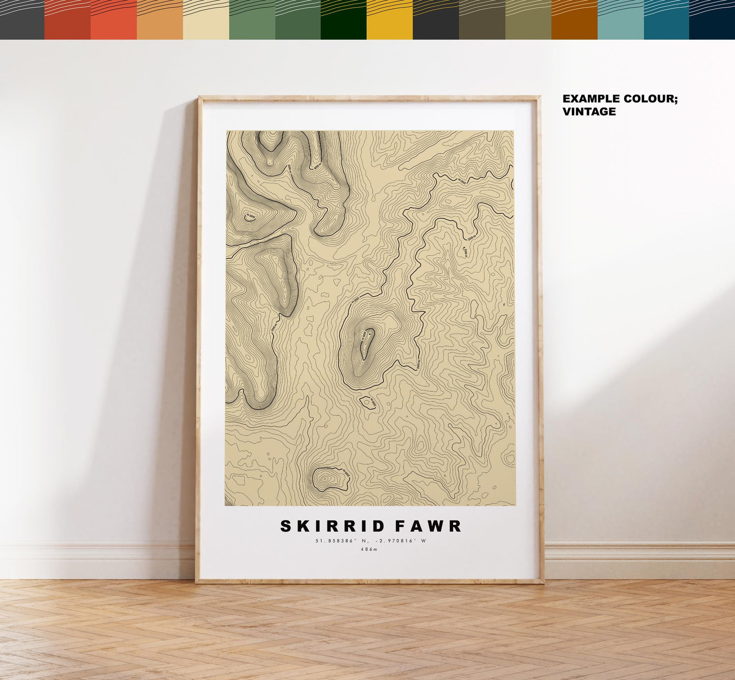 Skirrid Fawr contour map in a minimalist style, available in classic white/black or in a choice of map colours (see listing images). These contour maps are very detailed, with height markers at 200m intervals and the summit marked where possible - so the larger size the better!
