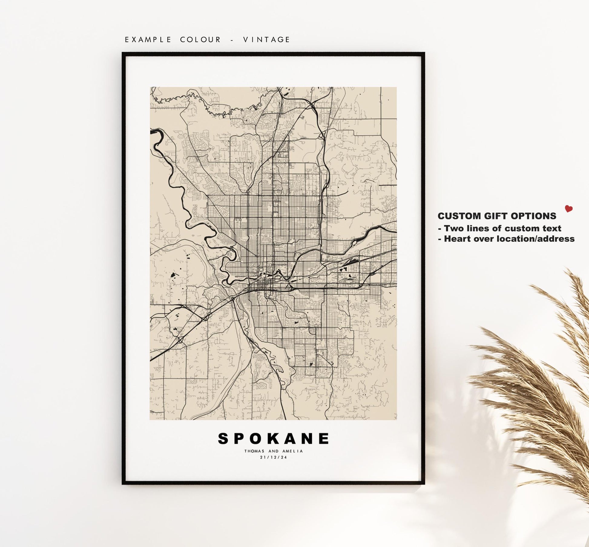 You can personalise this print by adding up to two lines of custom text beneath the city title, or by adding a heart over a location or address.