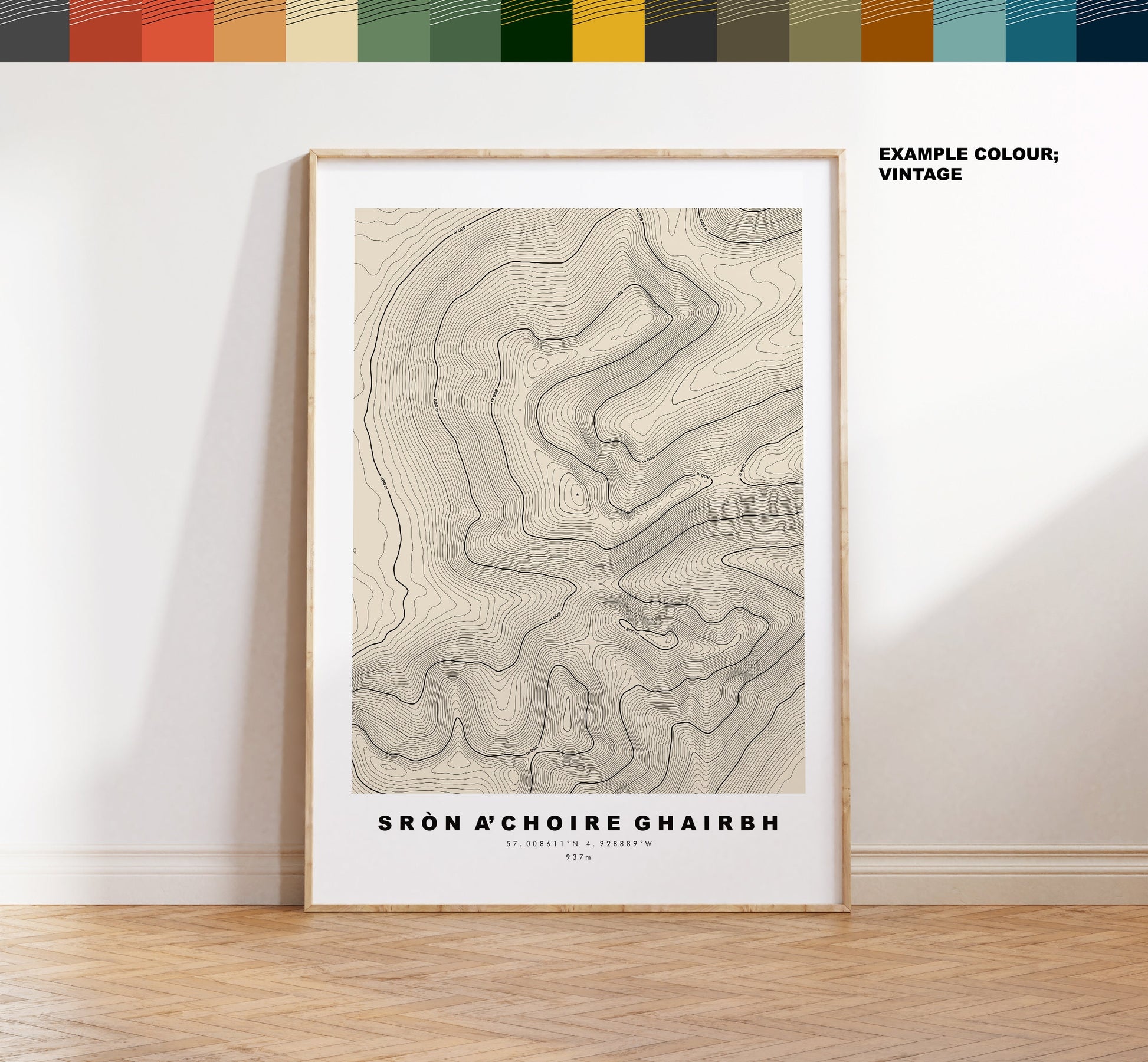 Sròn a' Choire Ghairbh contour map in a minimalist style, available in classic white/black or in a choice of map colours (see listing images). These contour maps are very detailed, with height markers at 200m intervals and the summit marked where possible - so the larger size the better!