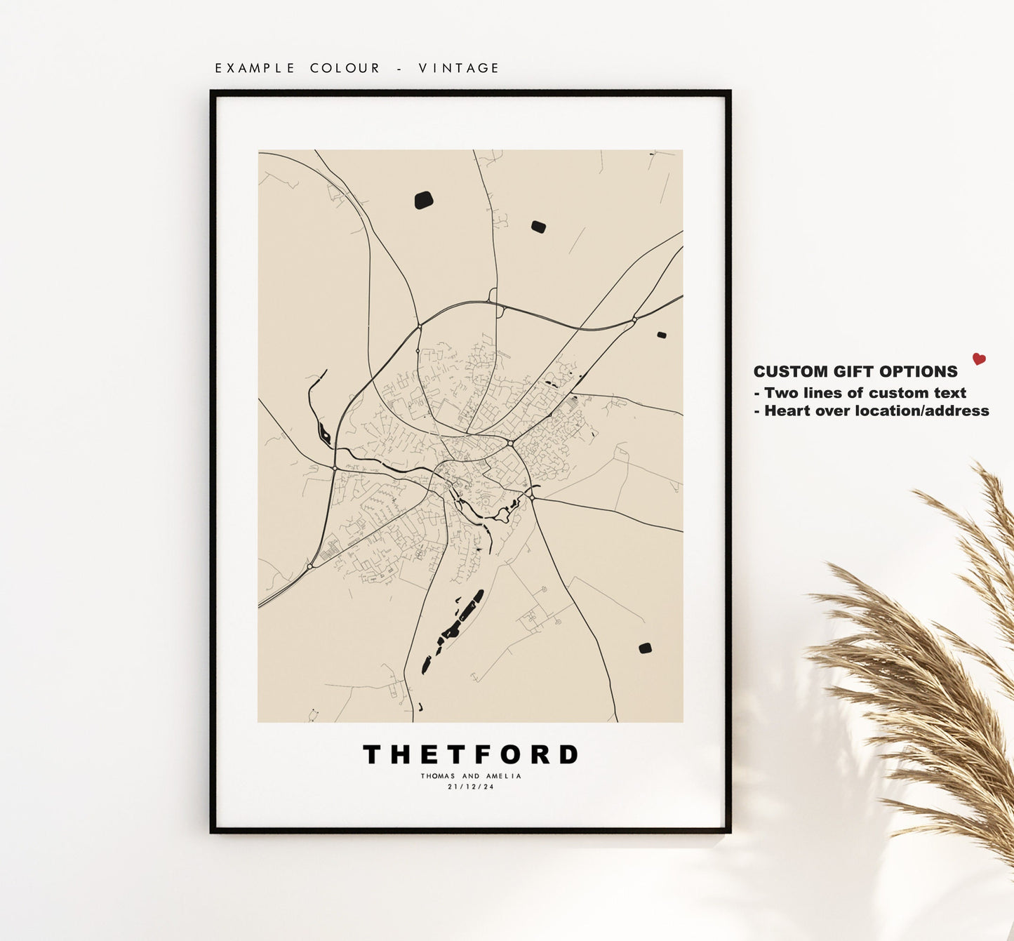 Thetford map in a minimalist black/white style or choose from a range of colours. These maps look great as a feature piece or as part of a set over a statement piece of furniture. You can personalise this print by adding up to two lines of custom text beneath the city title, or by adding a heart over a location or address.