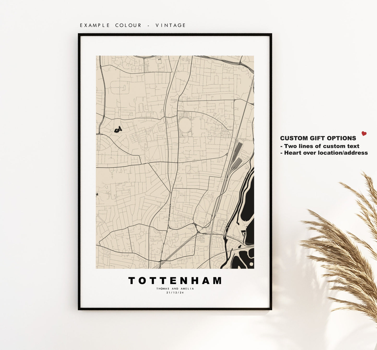 Tottenham map in a minimalist black/white style or choose from a range of colours. These maps look great as a feature piece or as part of a set over a statement piece of furniture. You can personalise this print by adding up to two lines of custom text beneath the city title, or by adding a heart over a location or address.