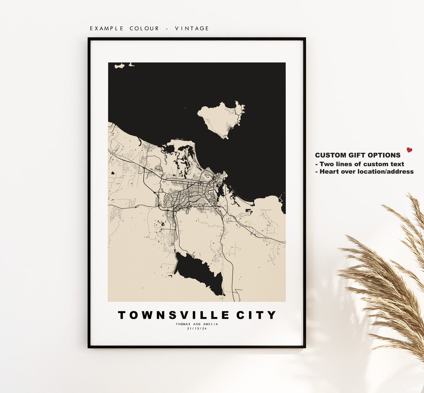 You can personalise this print by adding up to two lines of custom text beneath the city title, or by adding a heart over a location or address.