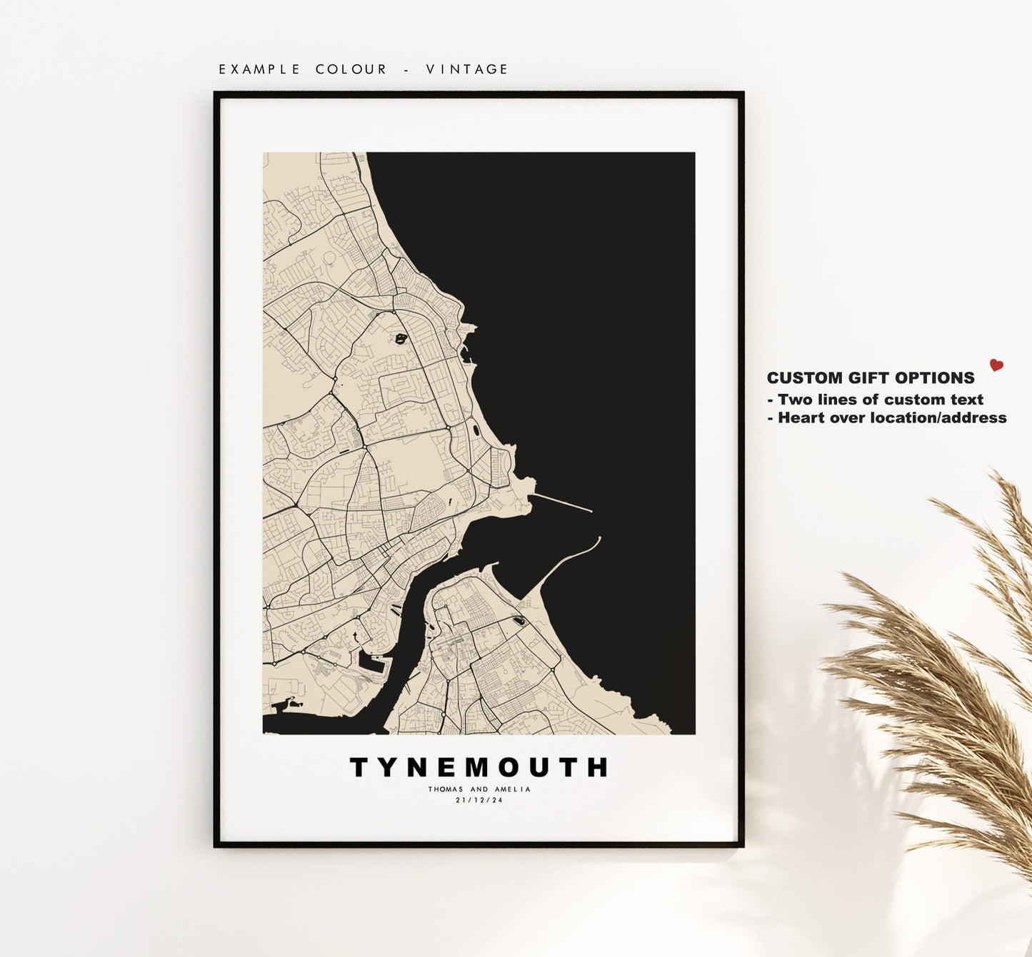 Tynemouth map in a minimalist black/white style or choose from a range of colours. These maps look great as a feature piece or as part of a set over a statement piece of furniture. You can personalise this print by adding up to two lines of custom text beneath the city title, or by adding a heart over a location or address.