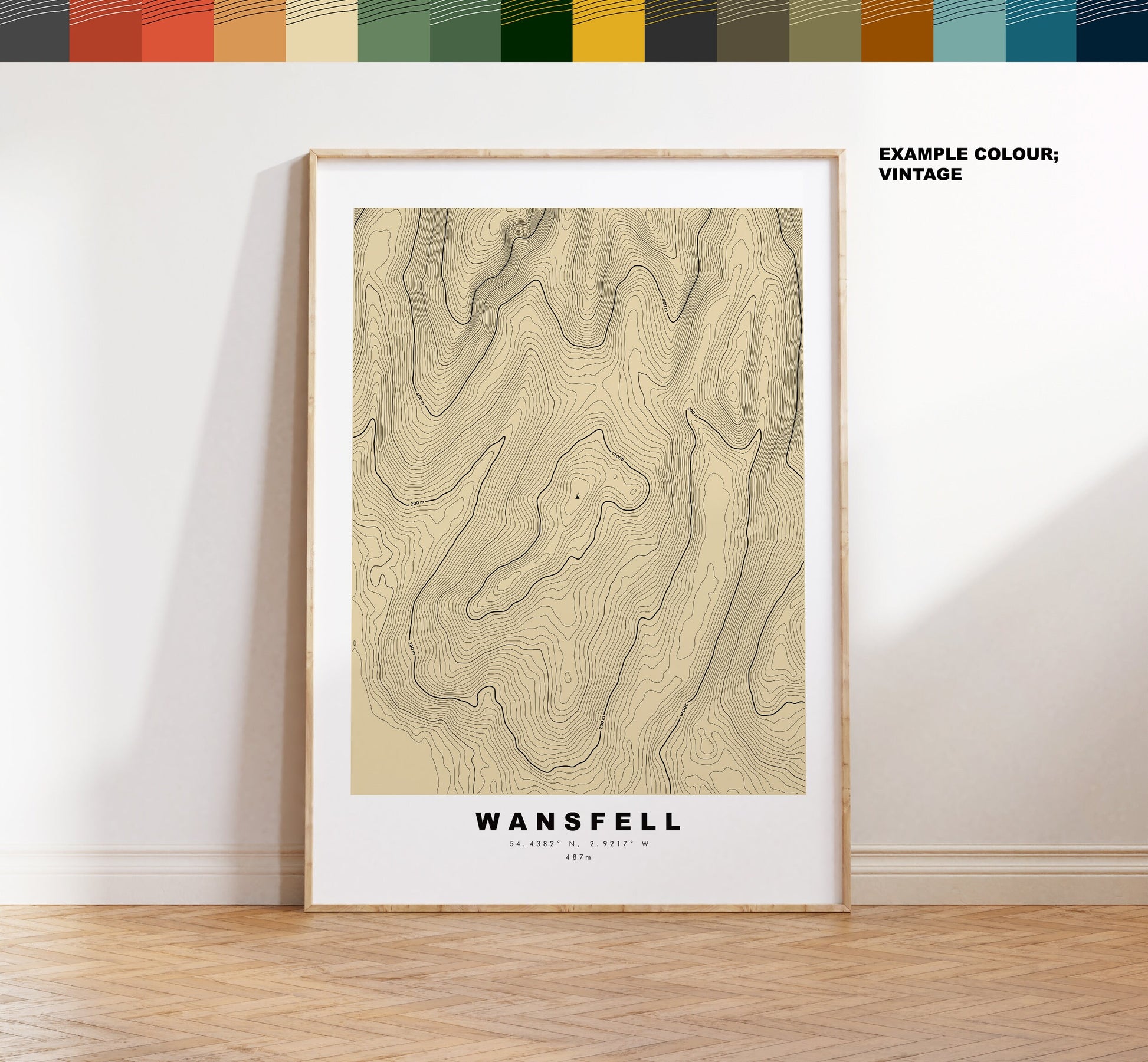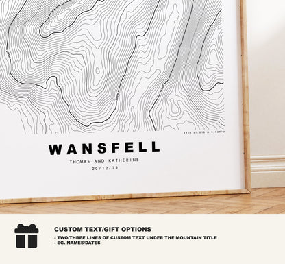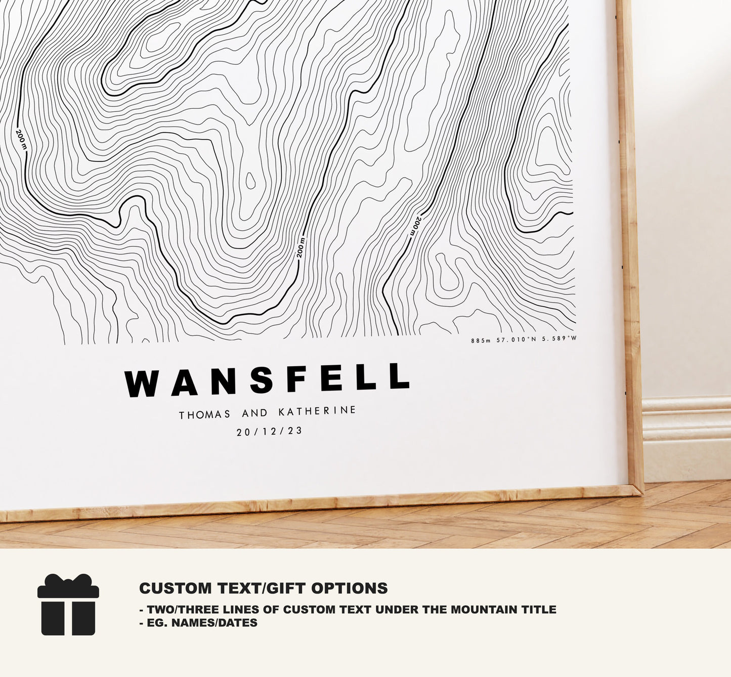 Wansfell contour map in a minimalist style, available in classic white/black or in a choice of map colours (see listing images). These contour maps are very detailed, with height markers at 200m intervals and the summit marked where possible - so the larger size the better!
