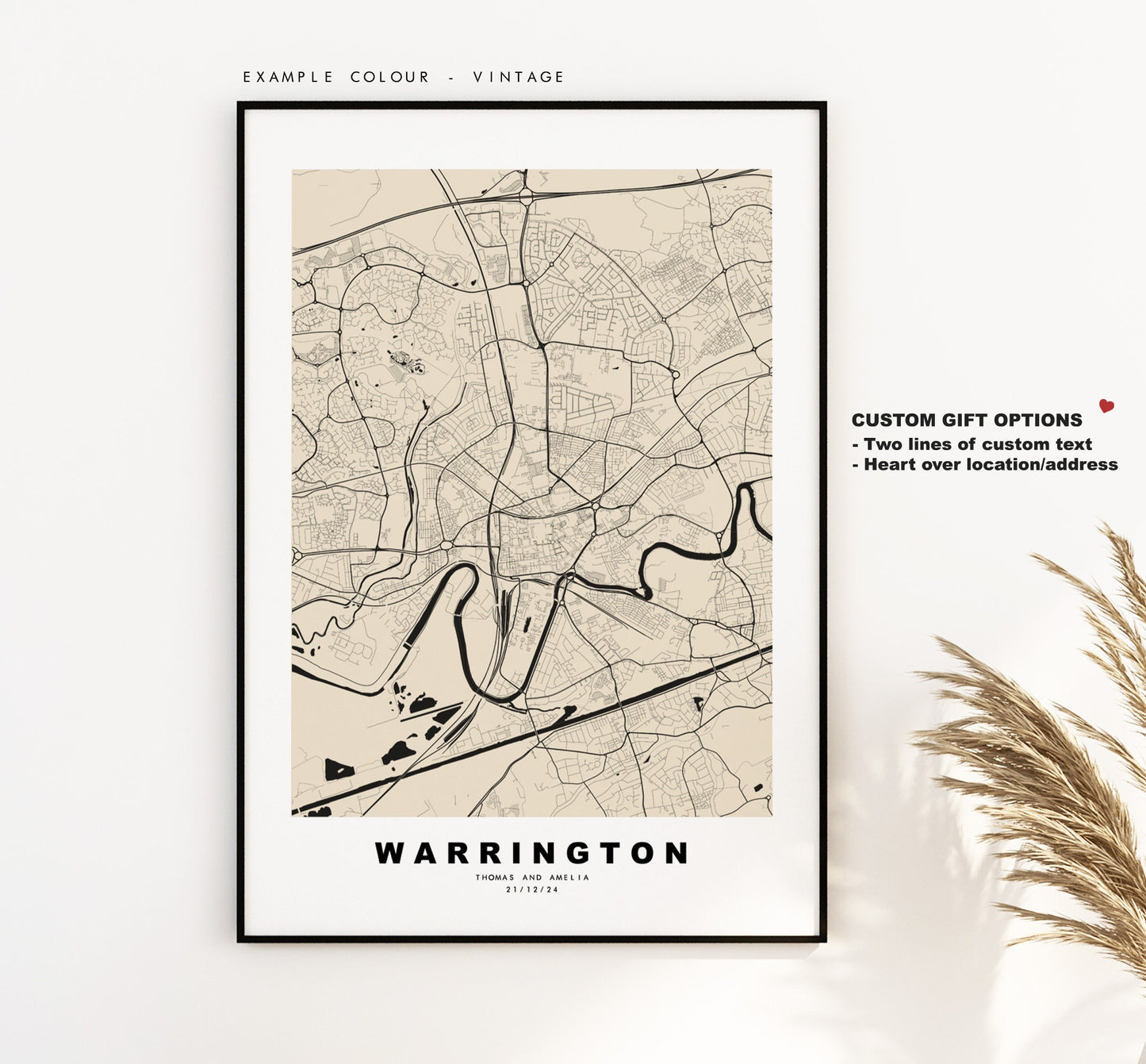 Warrington map in a minimalist black/white style or choose from a range of colours. These maps look great as a feature piece or as part of a set over a statement piece of furniture. You can personalise this print by adding up to two lines of custom text beneath the city title, or by adding a heart over a location or address.