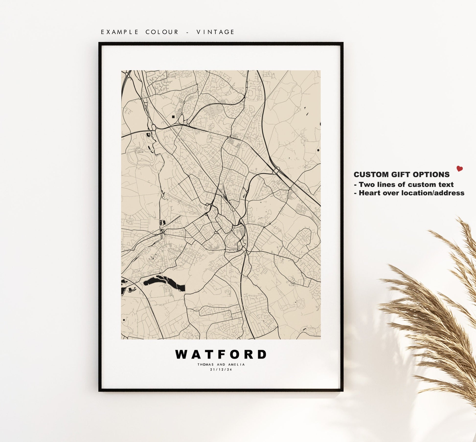 Watford map in a minimalist black/white style or choose from a range of colours. These maps look great as a feature piece or as part of a set over a statement piece of furniture. You can personalise this print by adding up to two lines of custom text beneath the city title, or by adding a heart over a location or address.