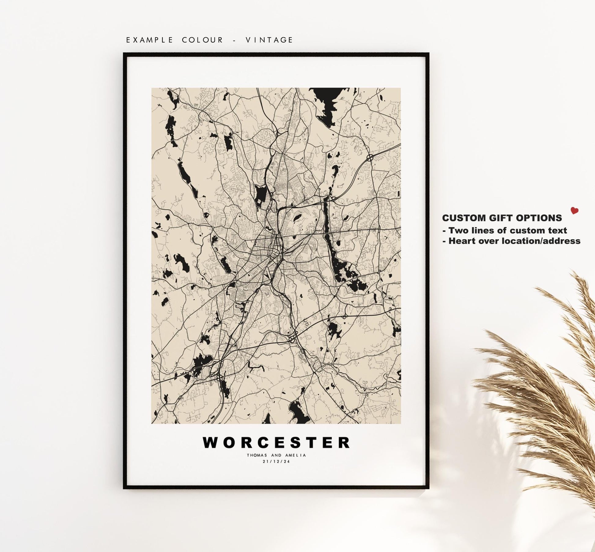 You can personalise this print by adding up to two lines of custom text beneath the city title, or by adding a heart over a location or address.